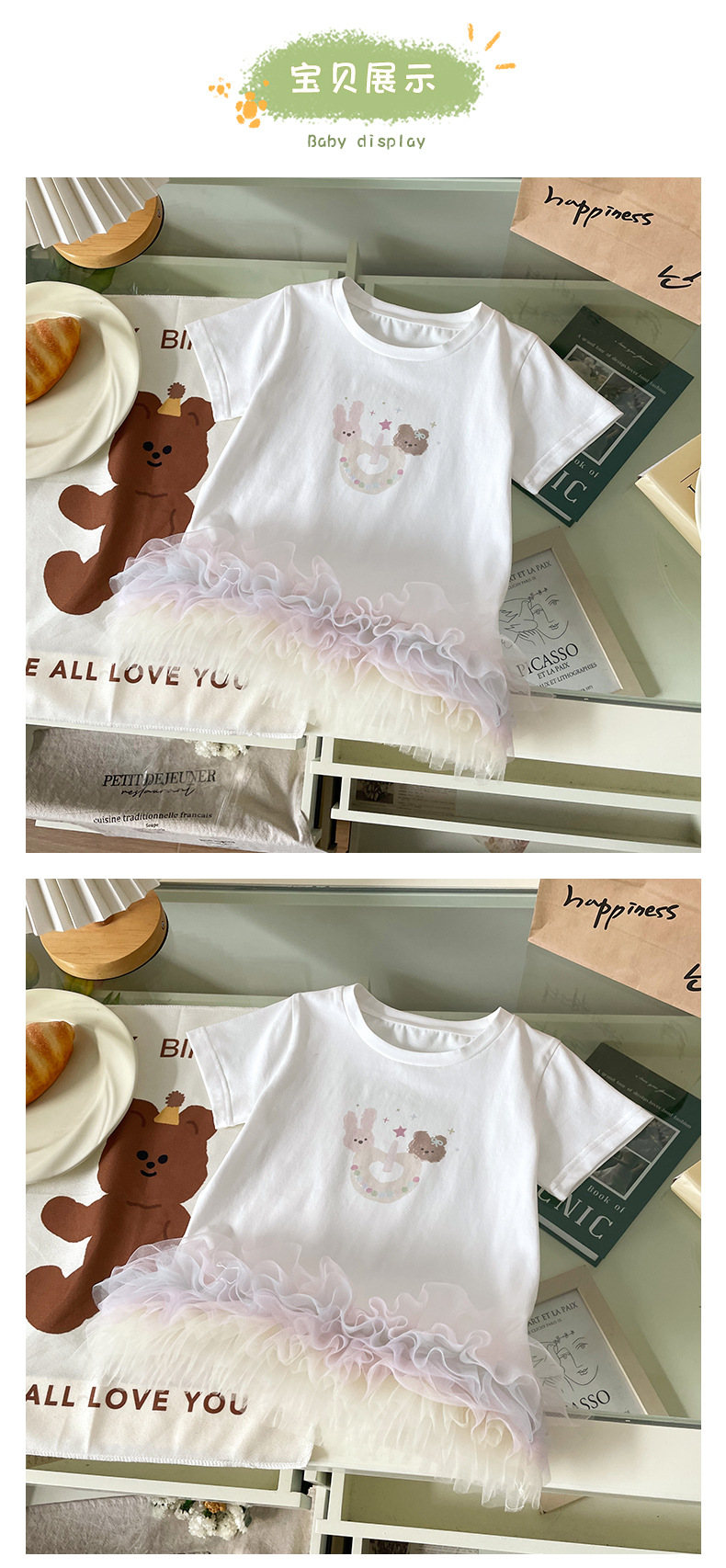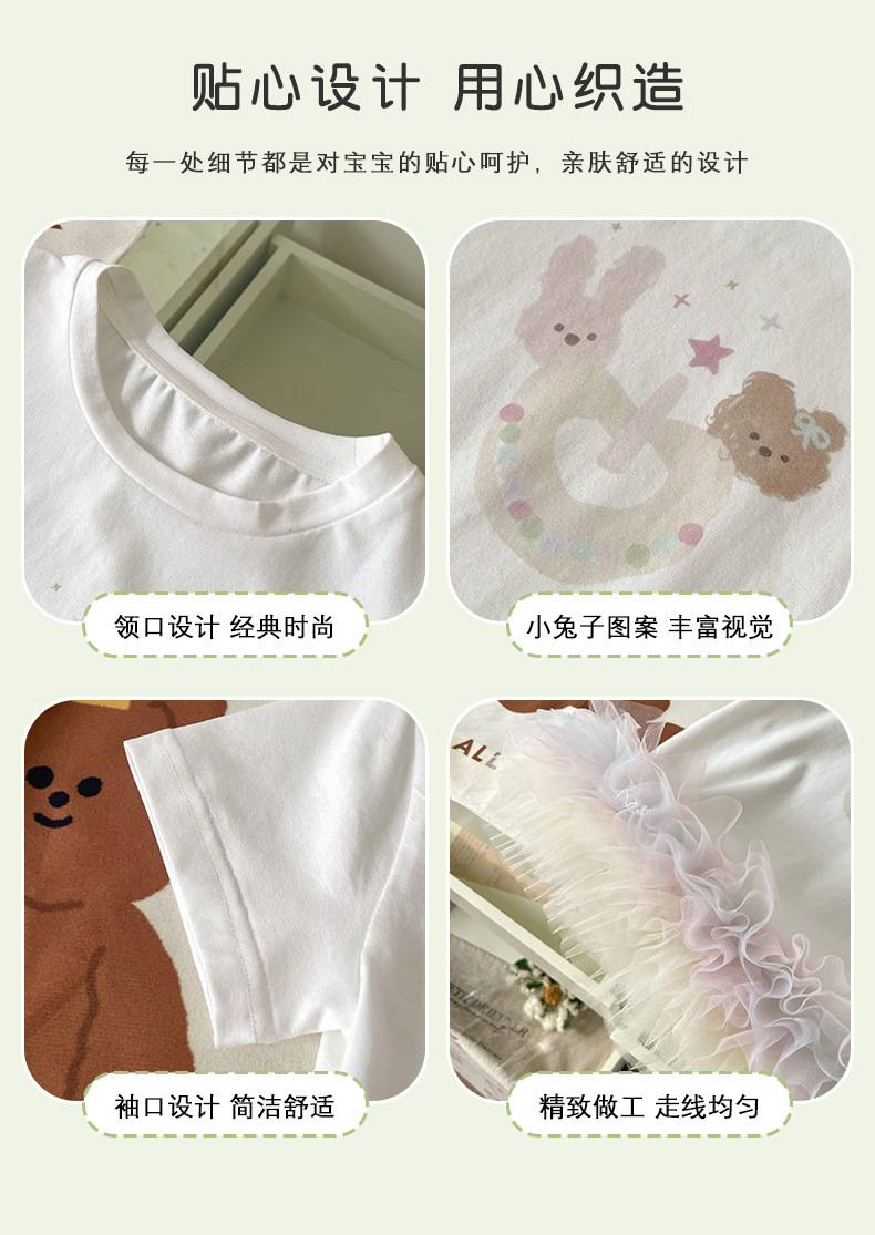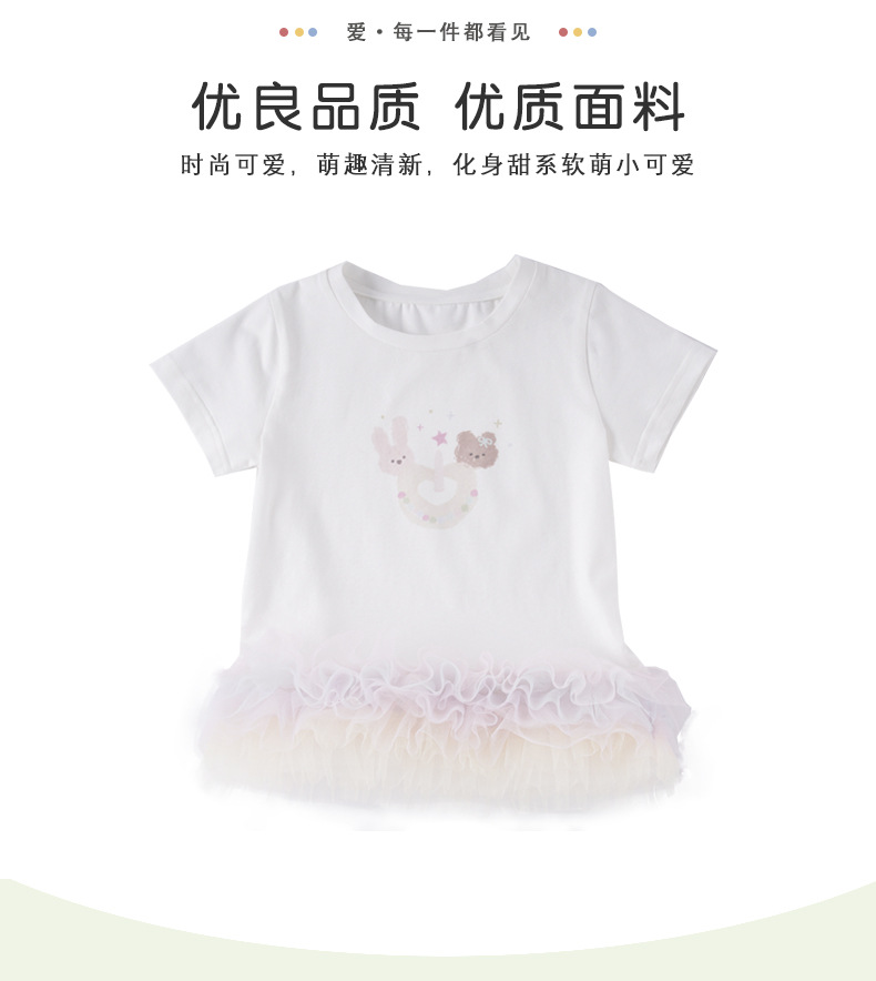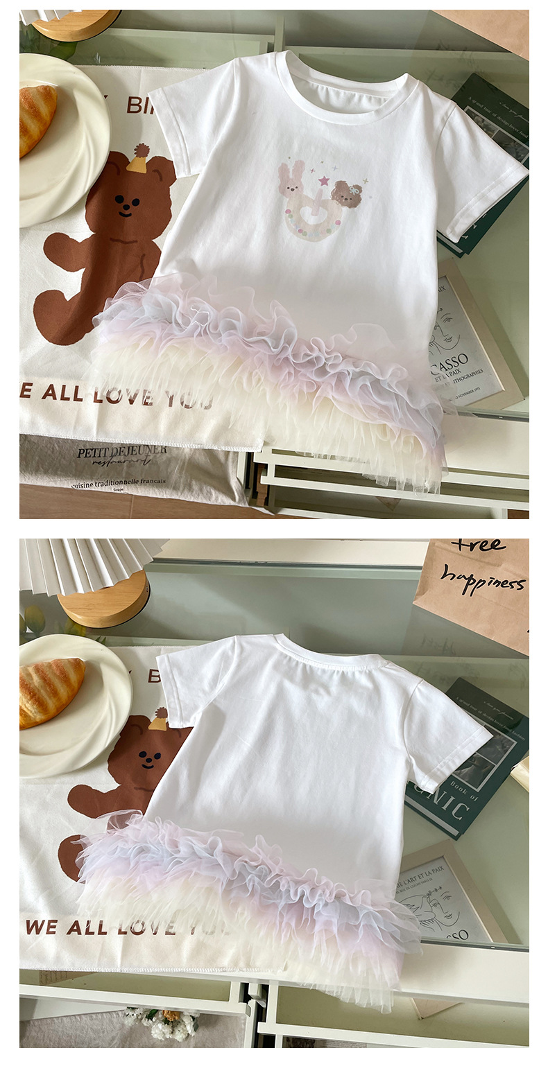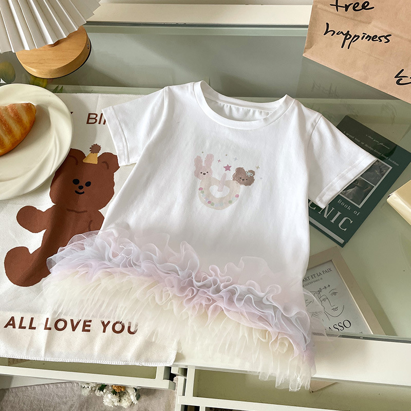 XQ259208 소녀 맞춤법 원사 티셔츠 원피스 2025 여름 새로운 만화 곰 스타일 컬러 메쉬 짧은 소매 트렌디스토어 가기
