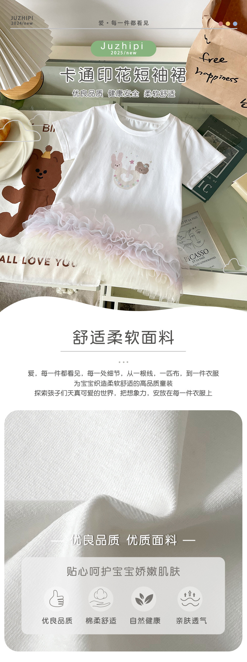 XQ259208 소녀 맞춤법 원사 티셔츠 원피스 2025 여름 새로운 만화 곰 스타일 컬러 메쉬 짧은 소매 트렌디