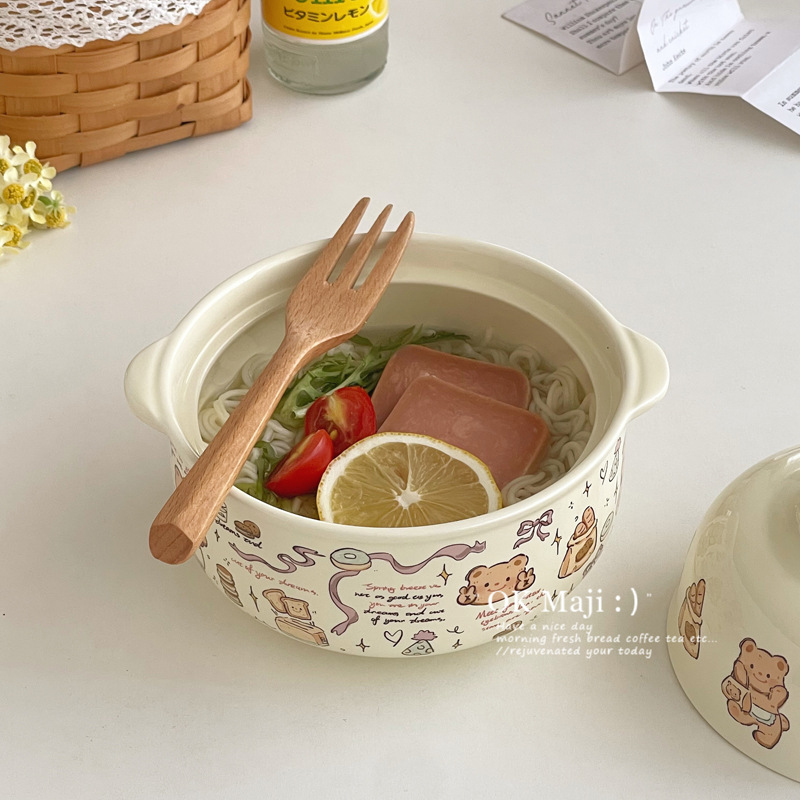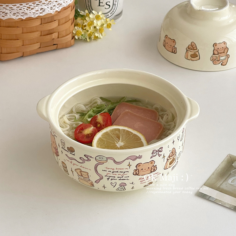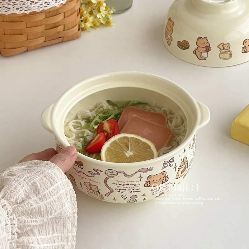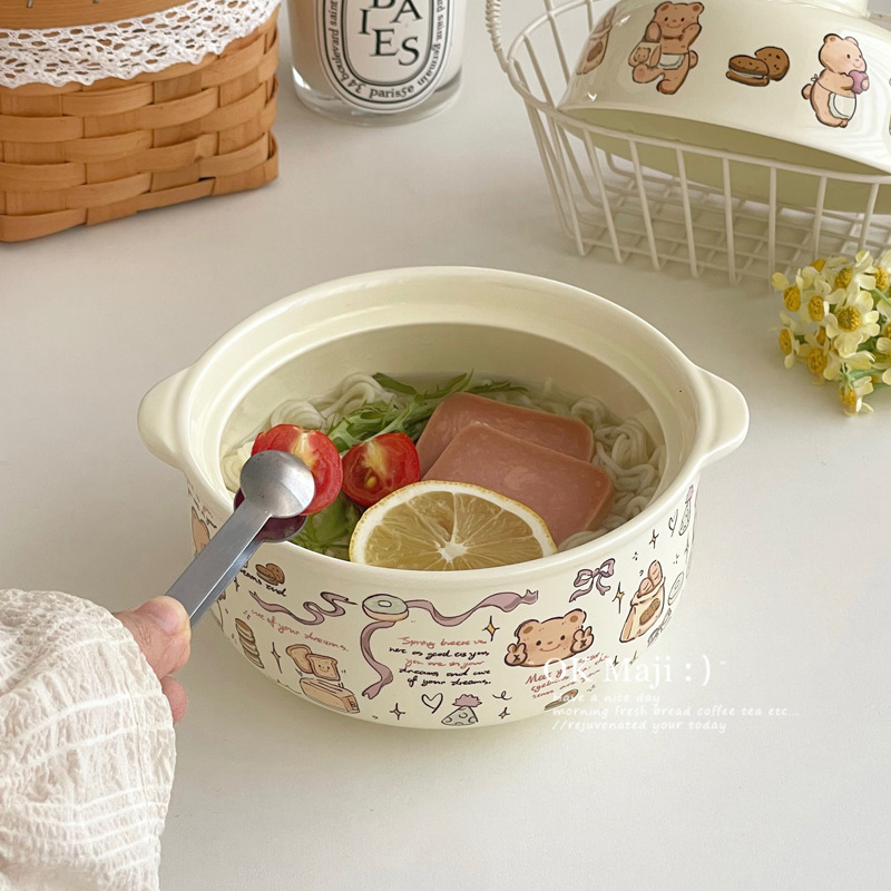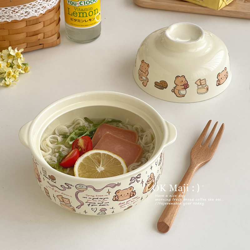 뚜껑이있는 기숙사 학생을위한 인스턴트 국수 그릇 대용량 세라믹 이중 귀 그릇 전자 레인지 높은 색상 가치 한국식 그릇 핸들스토어 가기