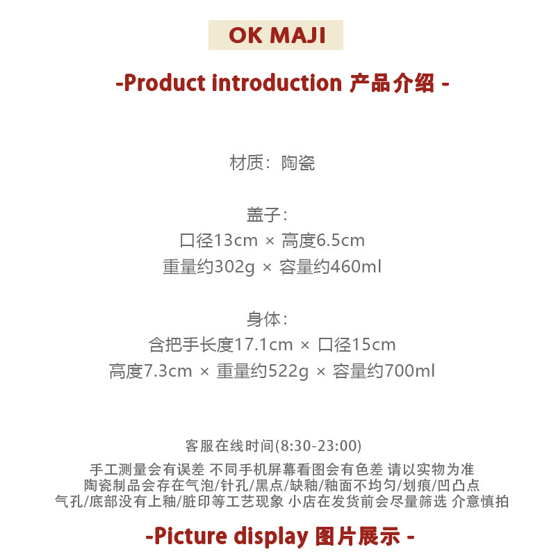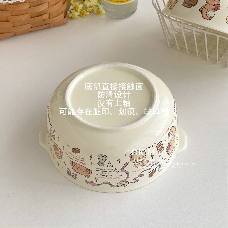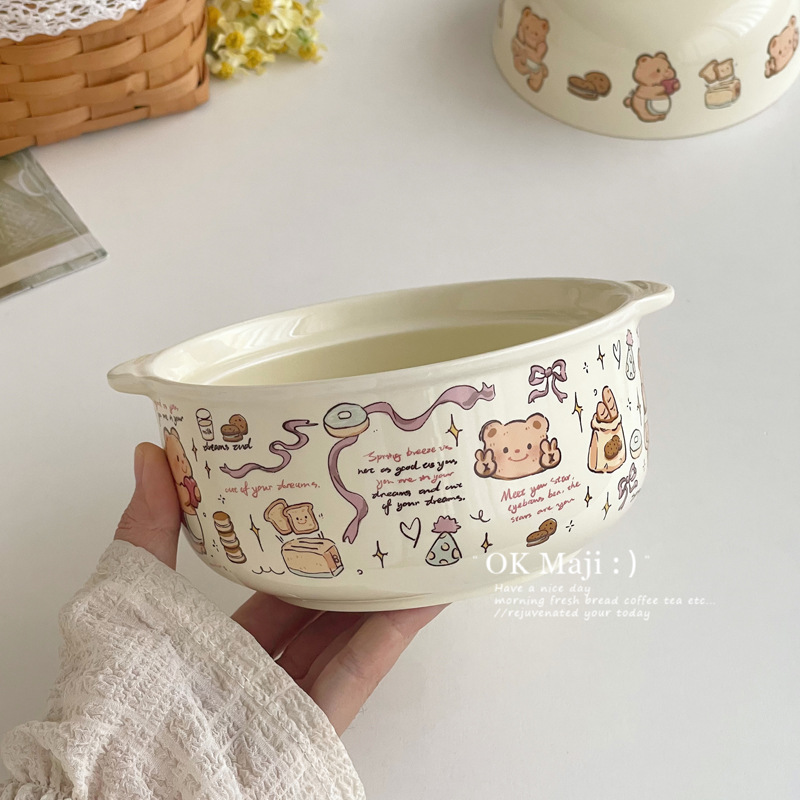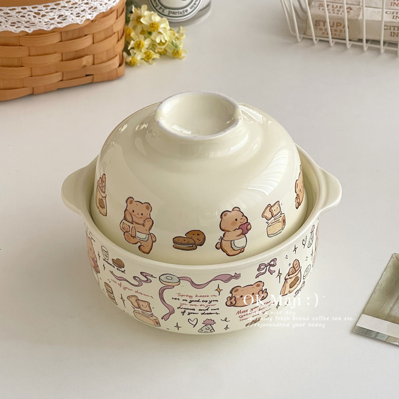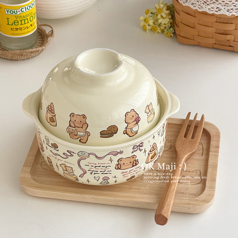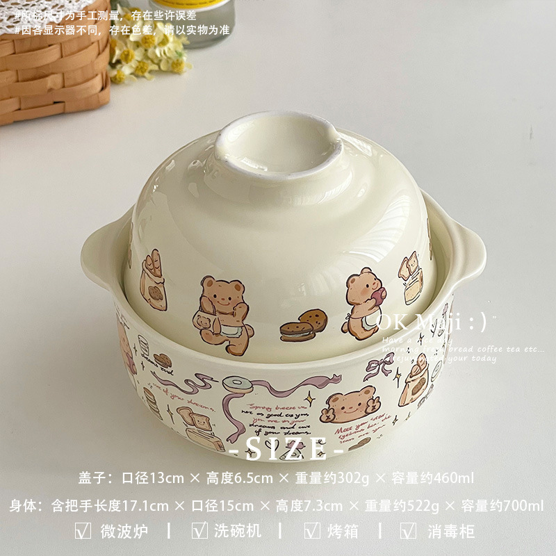 뚜껑이있는 기숙사 학생을위한 인스턴트 국수 그릇 대용량 세라믹 이중 귀 그릇 전자 레인지 높은 색상 가치 한국식 그릇 핸들스토어 가기