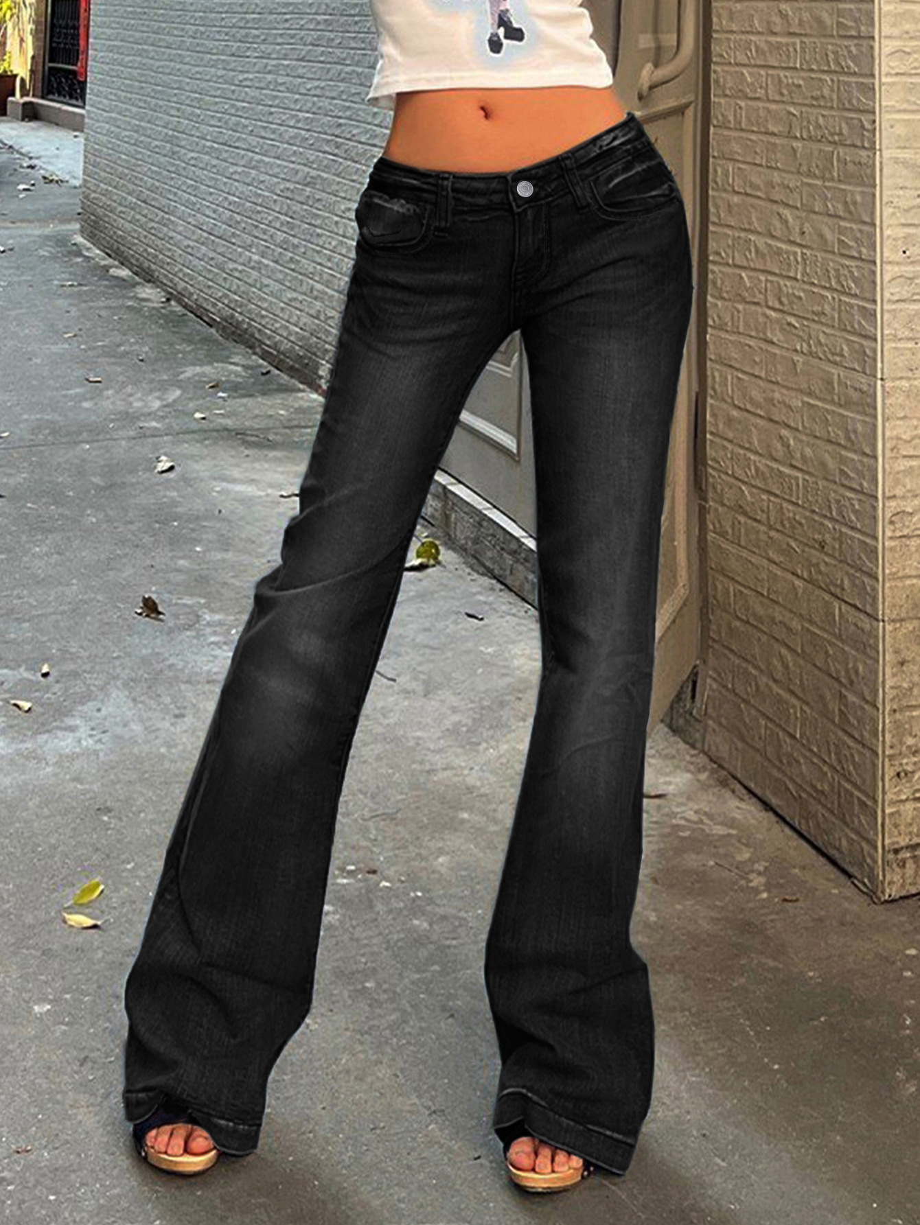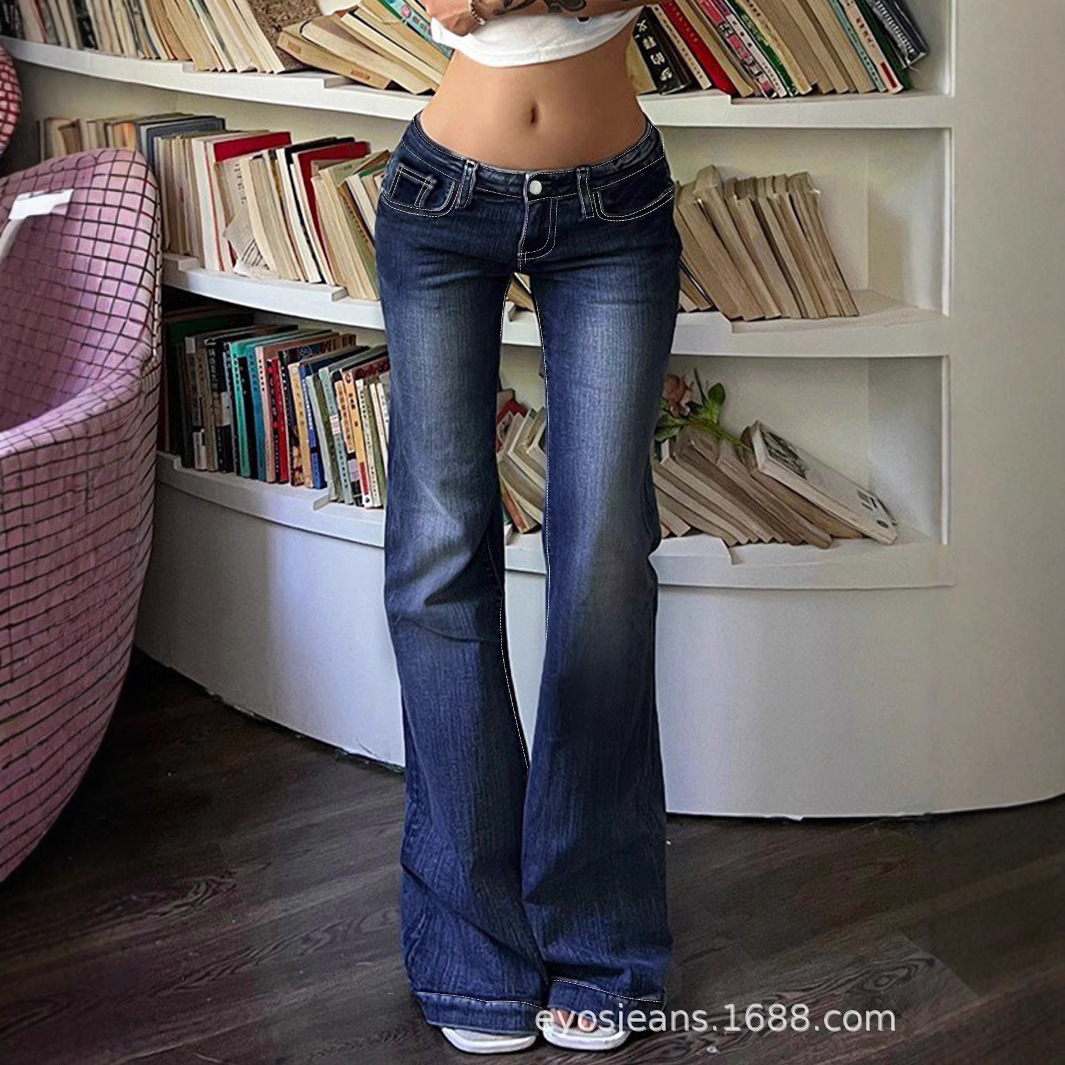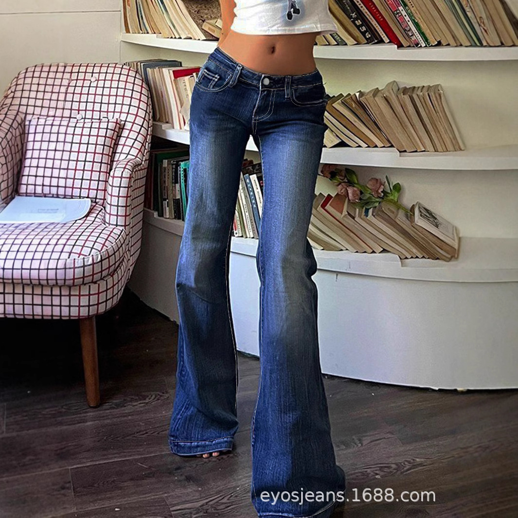 2026 레트로 로우웨이스트 블루 스트레이트 롱 팬츠 여성 도매 기본형 그라데이션 슬림핏 마이크로 플레어 청바지스토어 가기