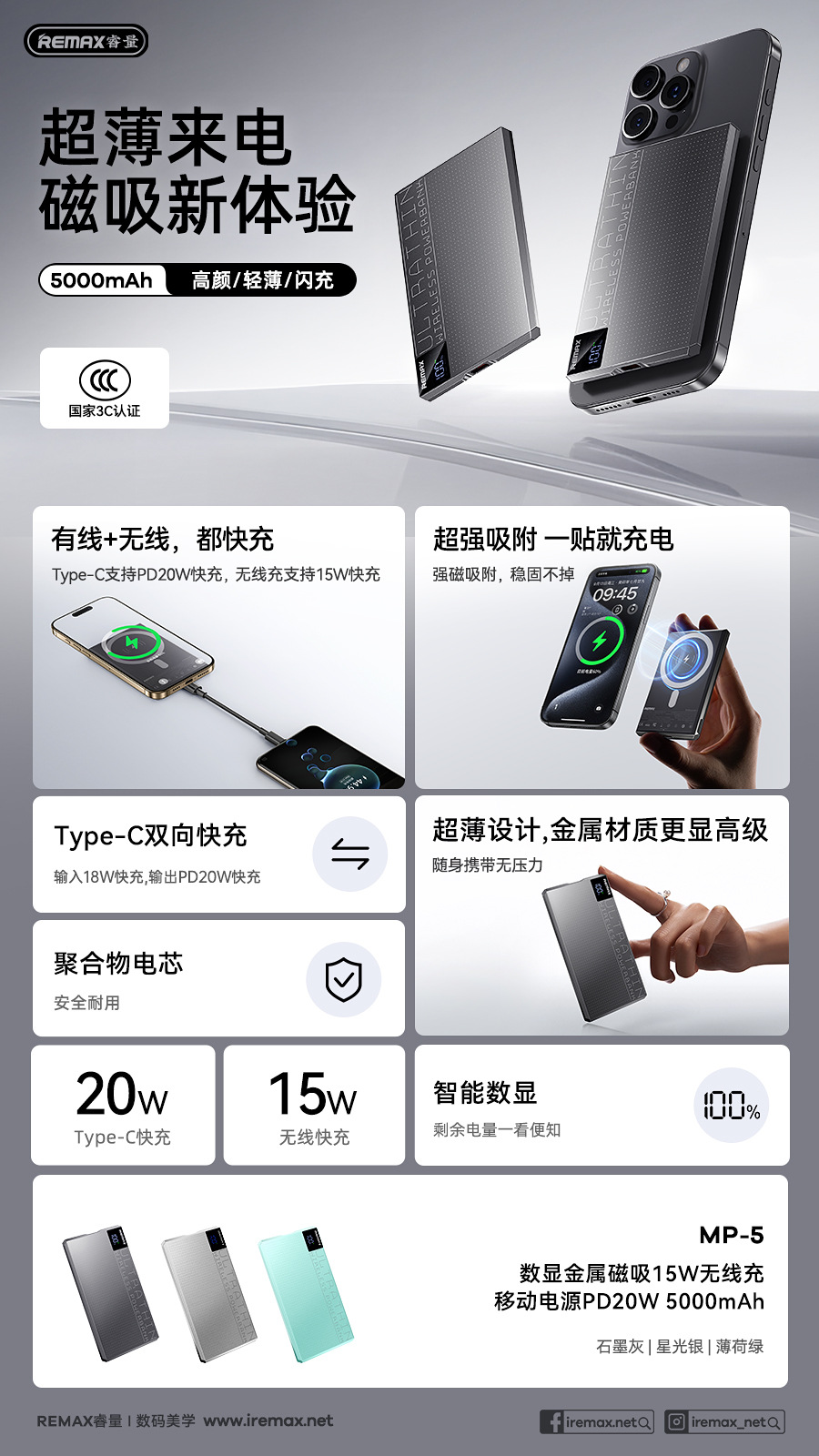 라인 PD20W 빠른 충전 10000 mA 모바일 전원 공급 장치로 초박형 금속 자기 무선 충전 보물을 remax