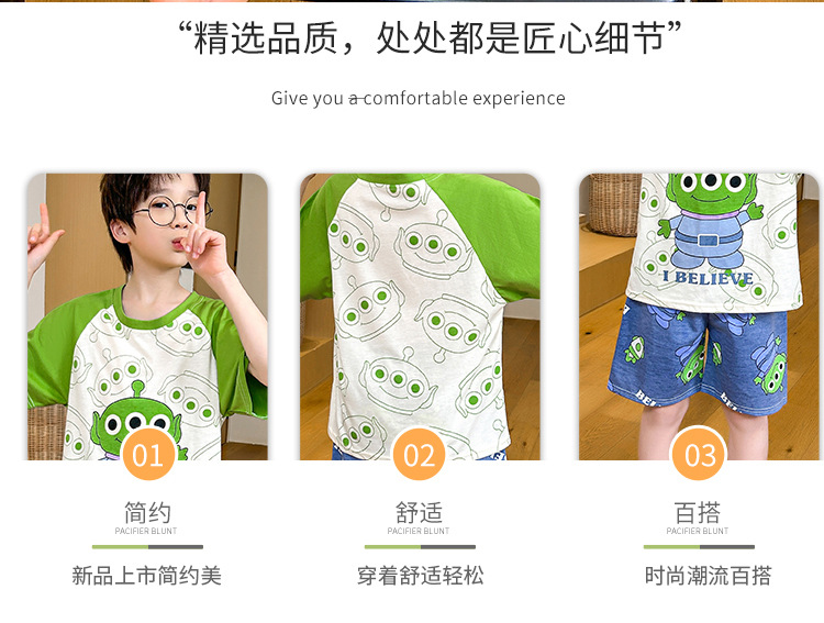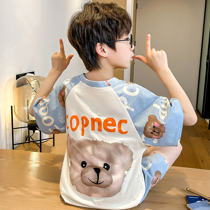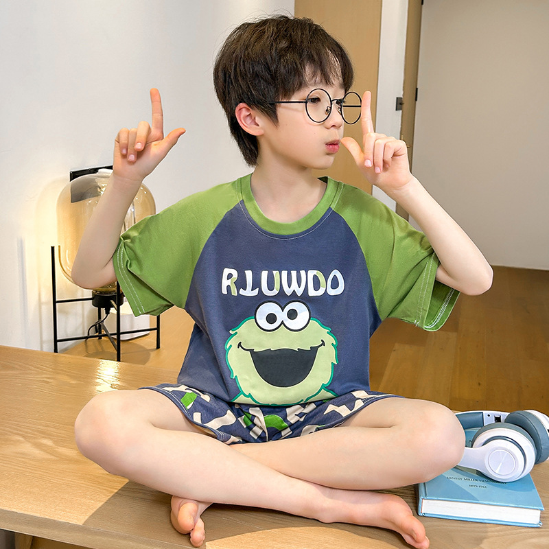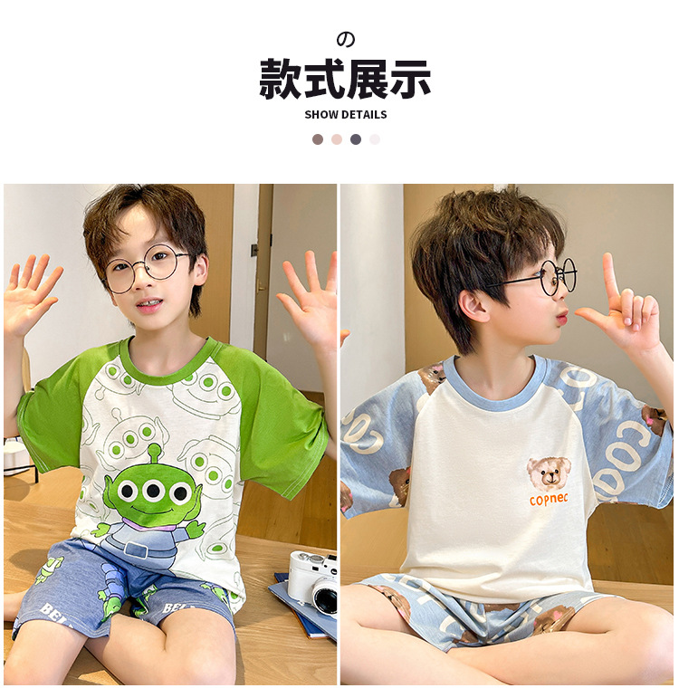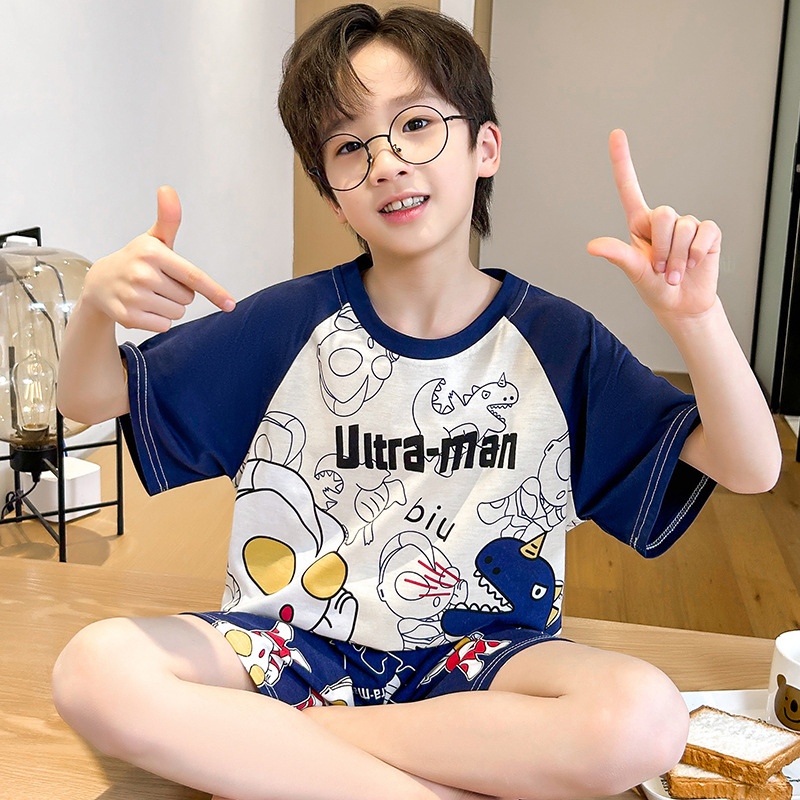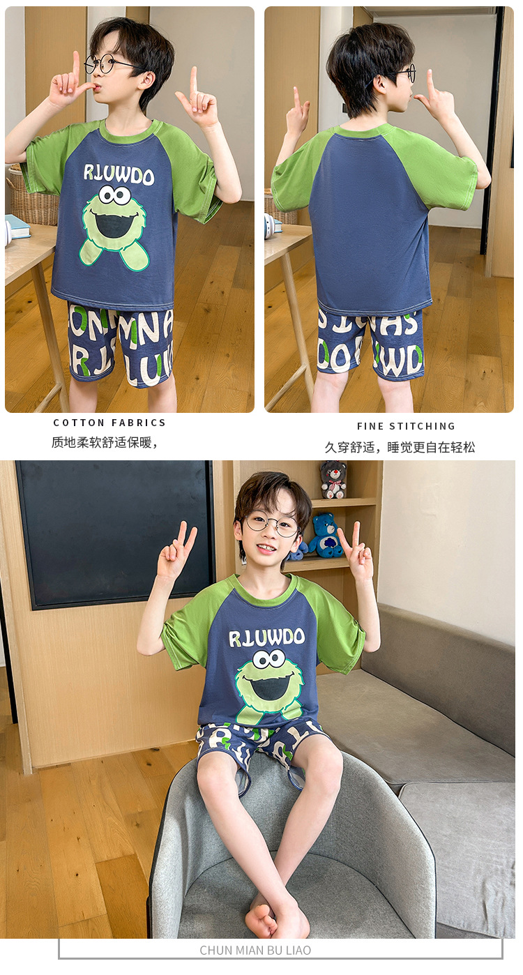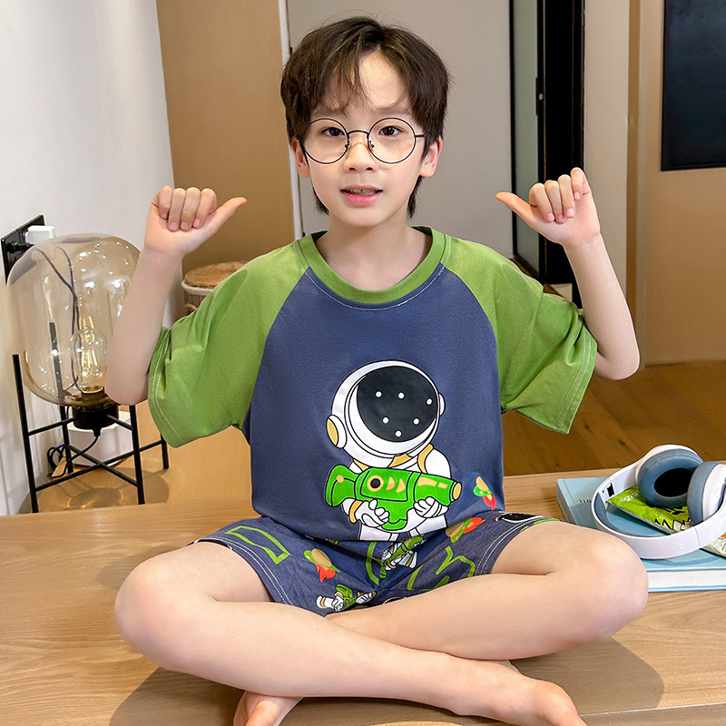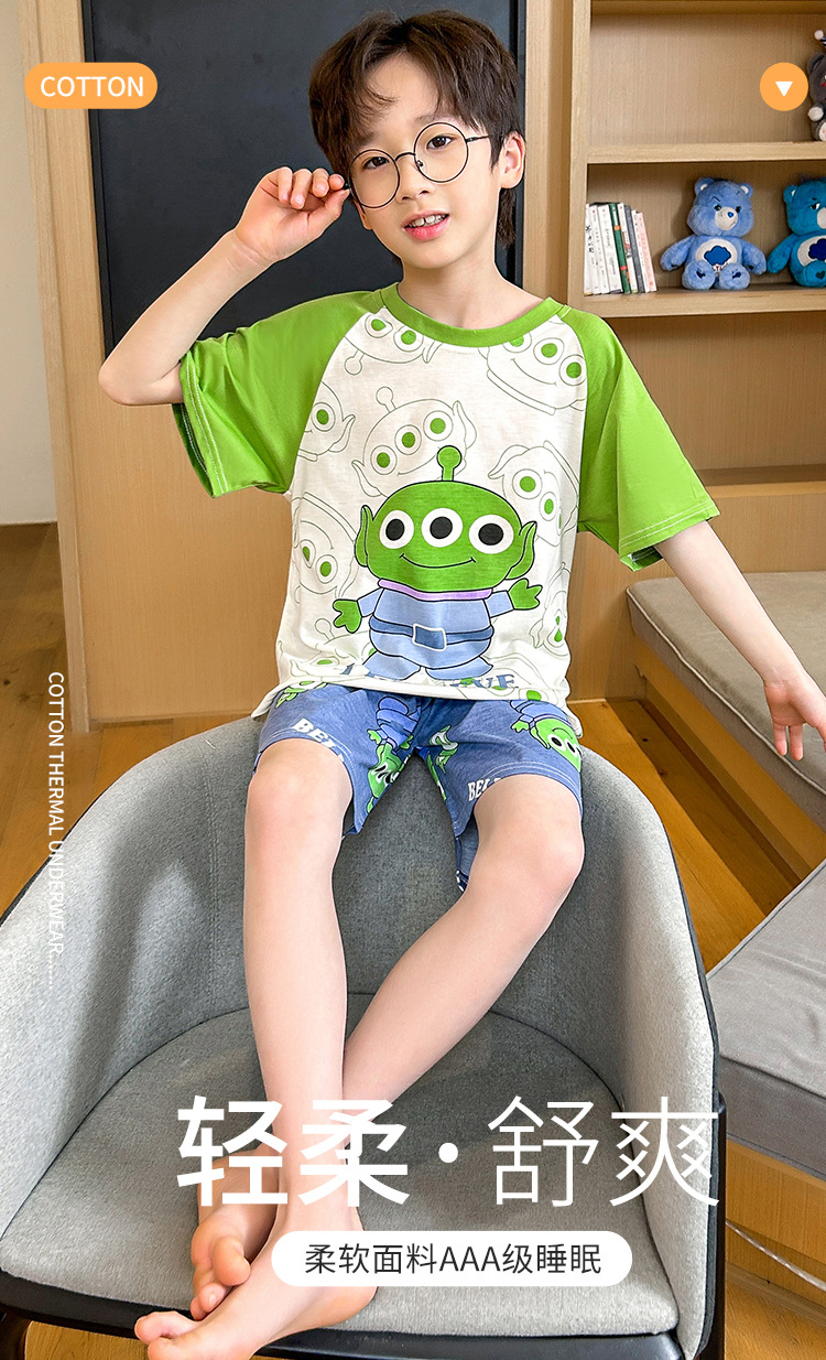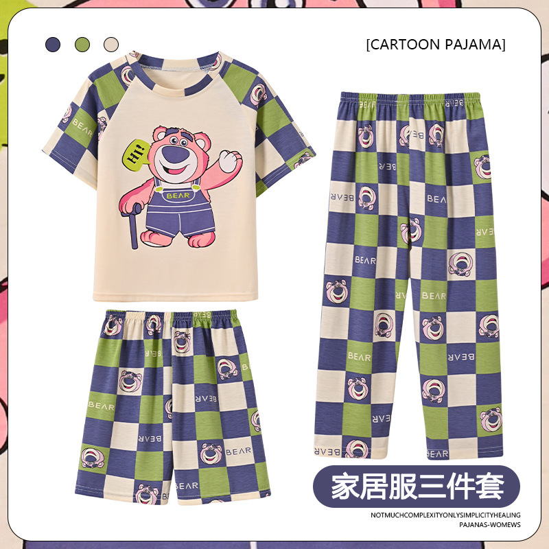 남학생 잠옷 여름 반팔 바지 세 조각 세트 어린이 소년 아기 만화 큰 어린이 여름 홈 옷스토어 가기