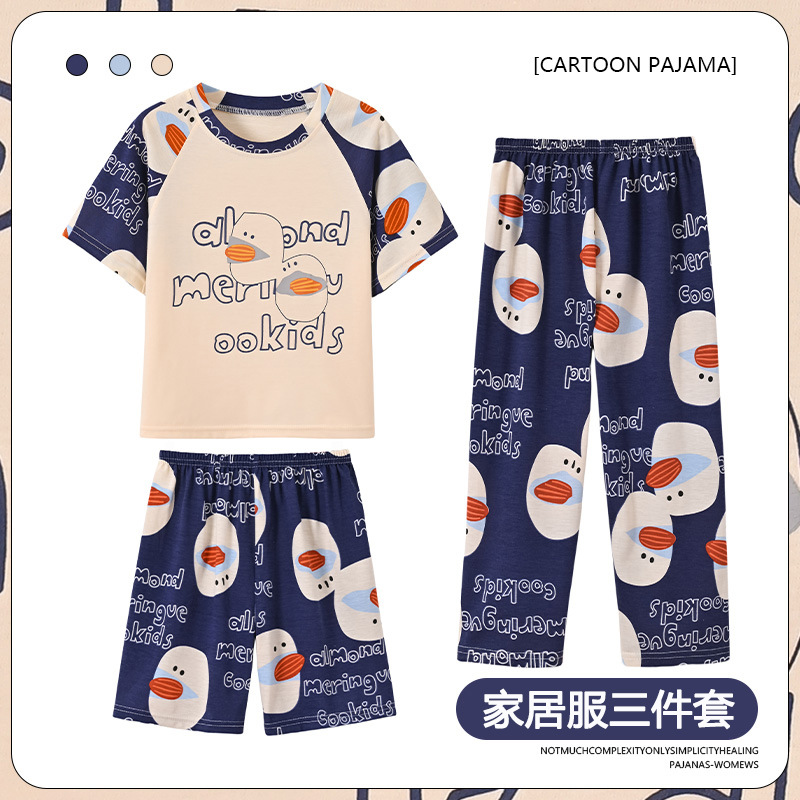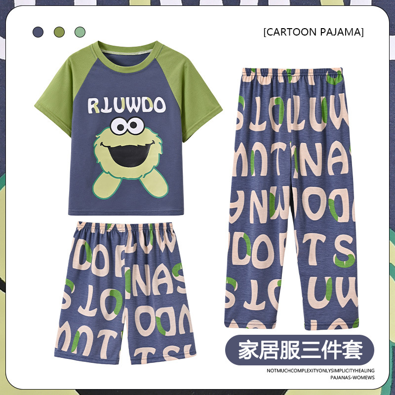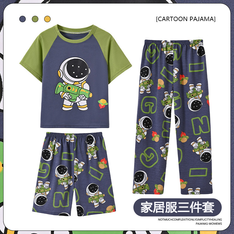 남학생 잠옷 여름 반팔 바지 세 조각 세트 어린이 소년 아기 만화 큰 어린이 여름 홈 옷