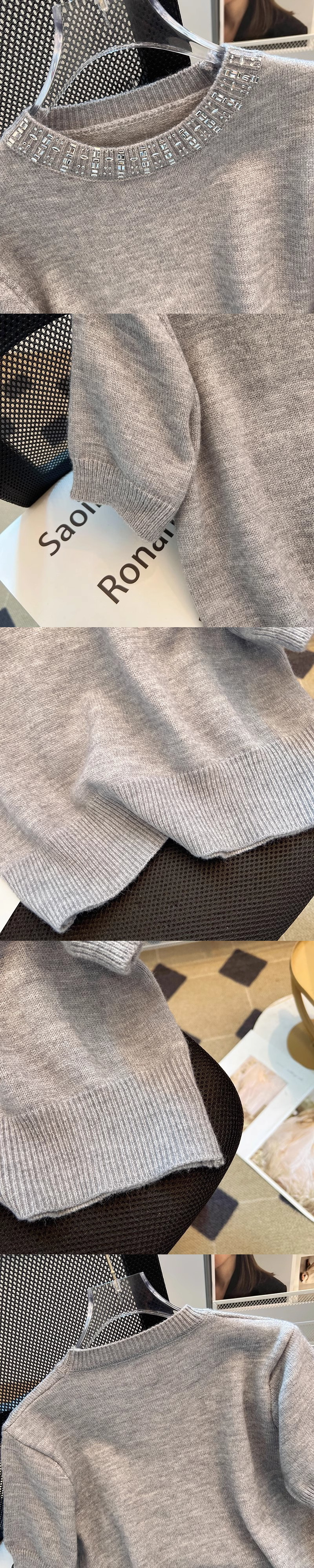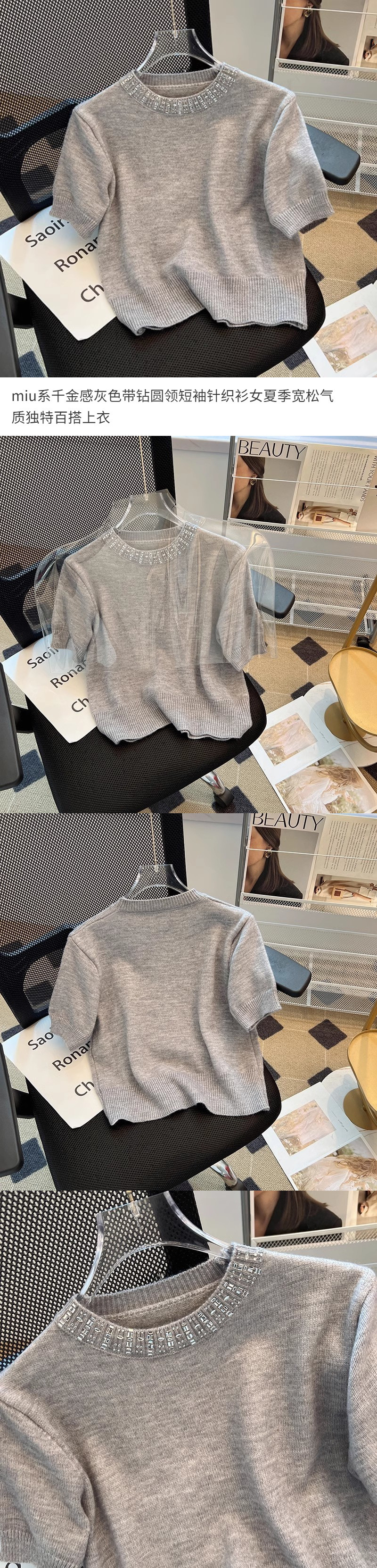Miu 스타일 유제품 그레이 라운드 넥 반팔 니트 스웨터 여성의 여름 느슨한 우아한 독특한 올 매치 탑