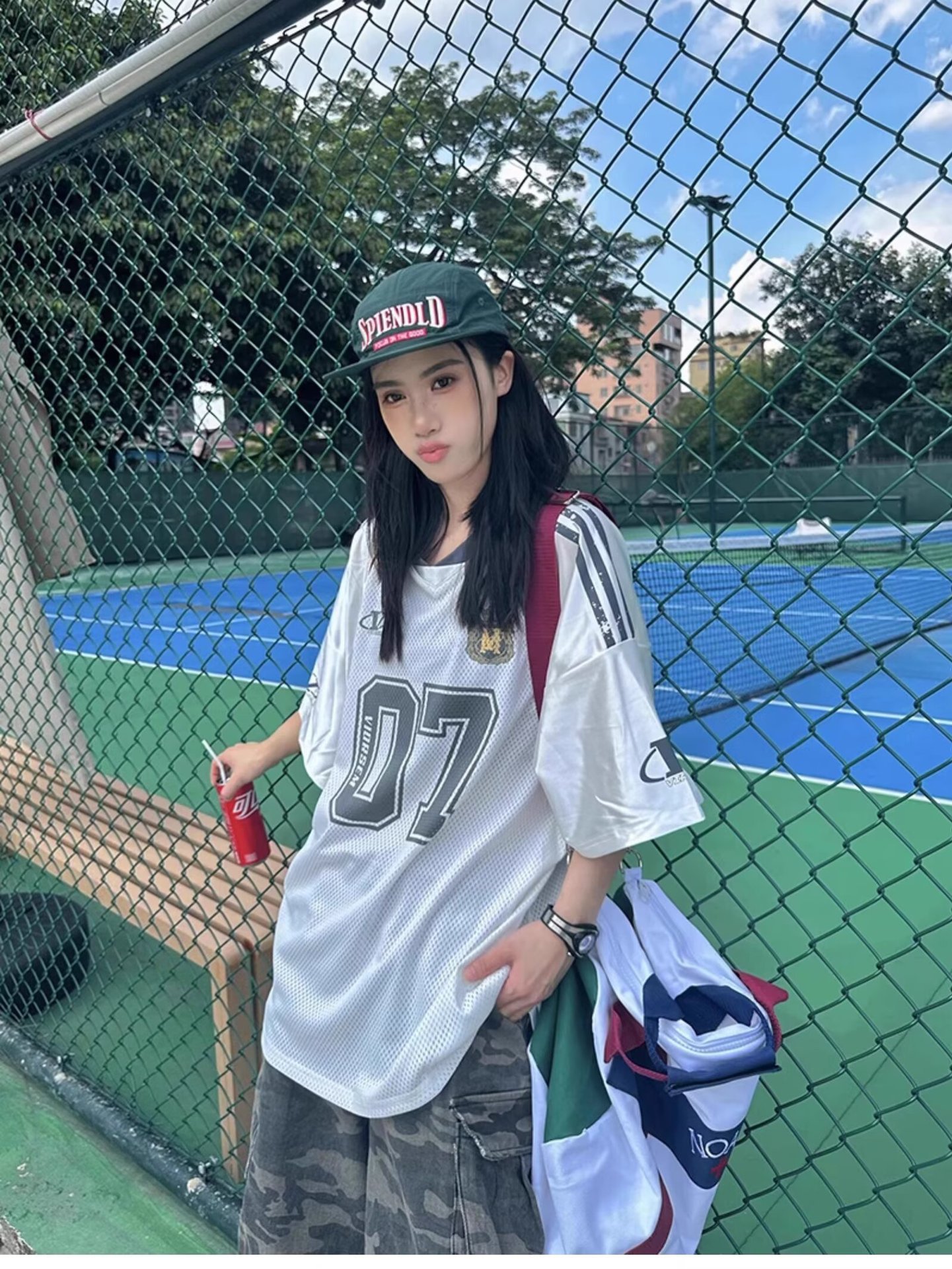 아메리칸 스타일 레트로 07 레터 그래피티 프린트 메쉬 저지 하프 슬리브 티셔츠 남성용 루즈 힙 틈새 탑