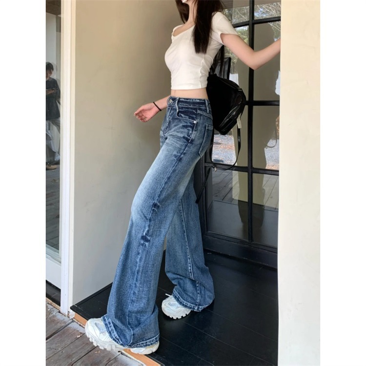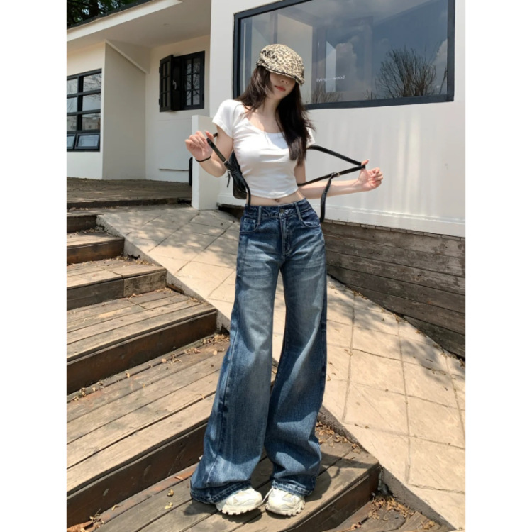 175 키가 큰 미국 스타일 복고풍 세탁 블루 청바지 여성의 여름 높은 허리 슬림 핏 마이크로 팬츠스토어 가기