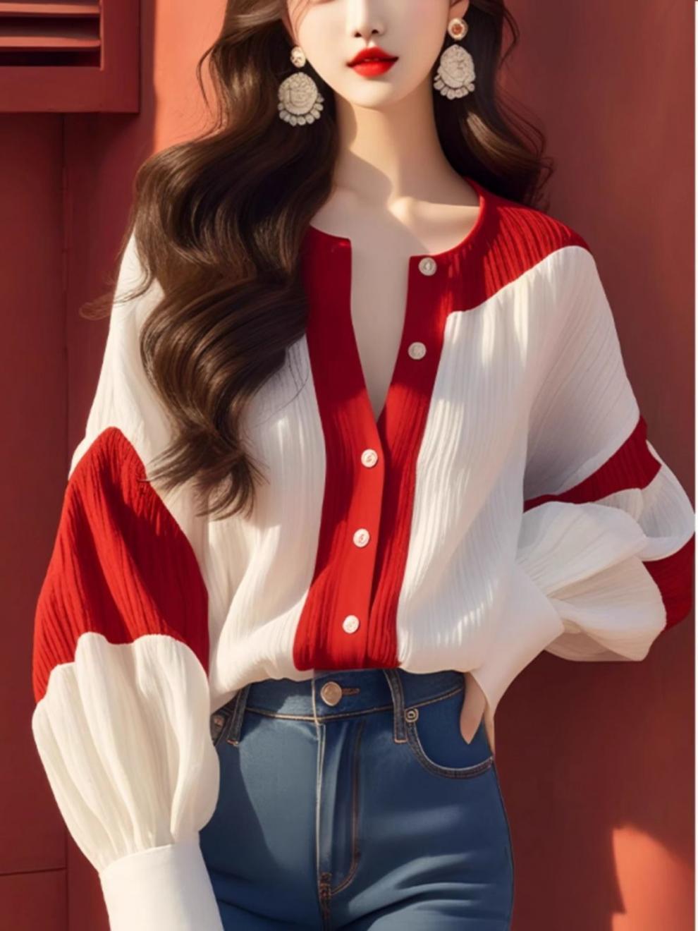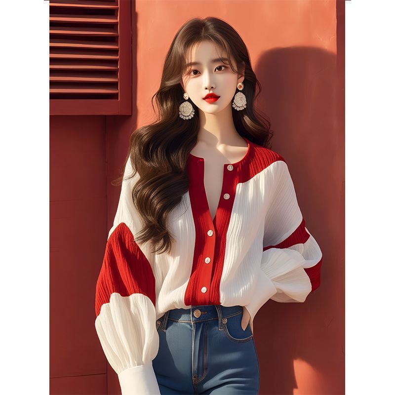 빨간색과 흰색 대비 컬러 랜턴 슬리브 쉬폰 셔츠 2025 초가을 새로운 프랑스 라이트 럭셔리 고급 고급 고급 세련된 여성 의류스토어 가기