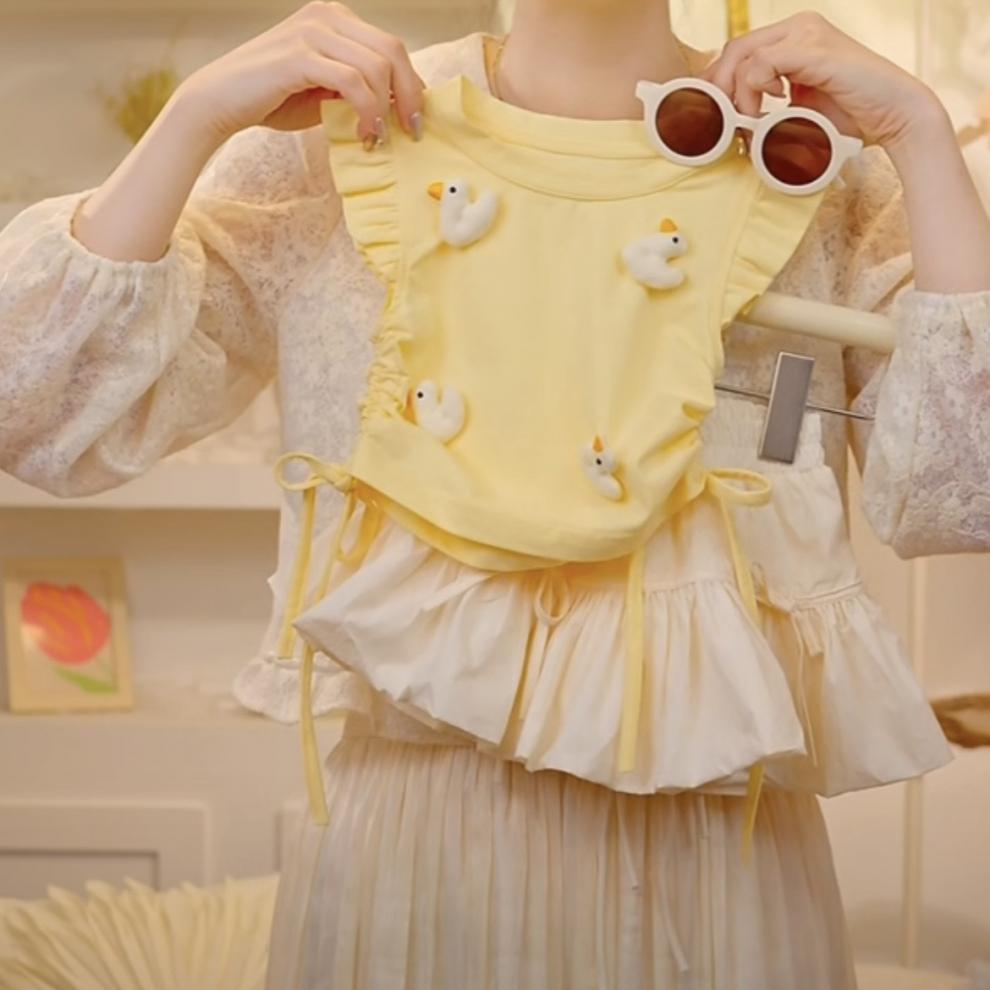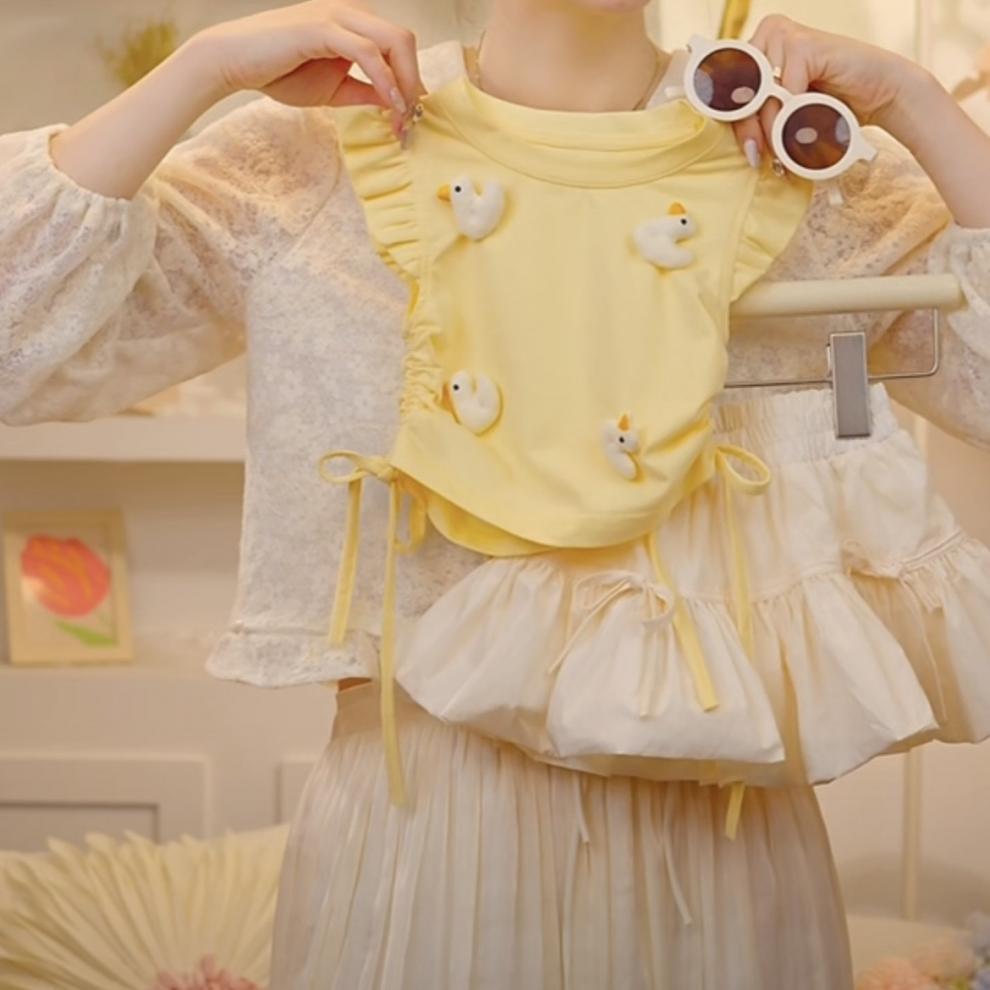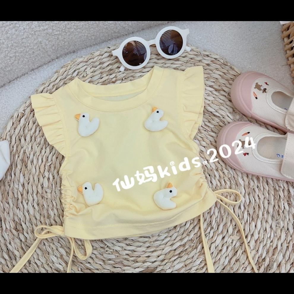 여자 여름 새 세트 2025 아기 귀여운 어린이 작은 오리 비행 슬리브 탑 어린이 버드 투피스 세트