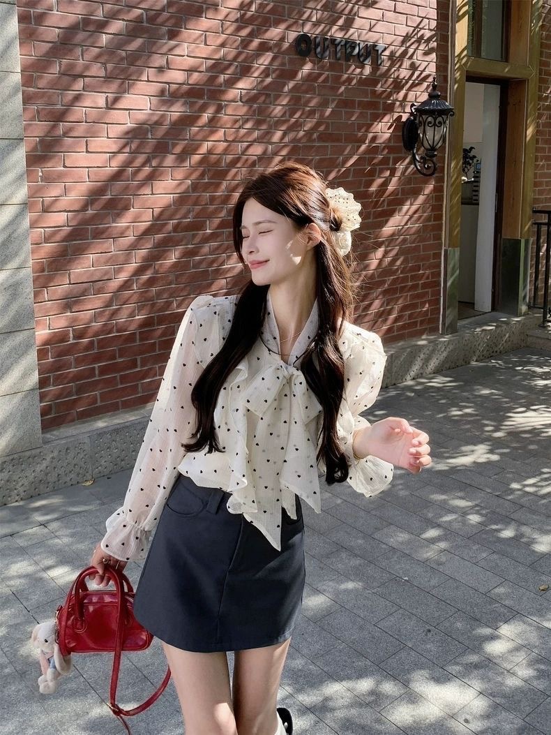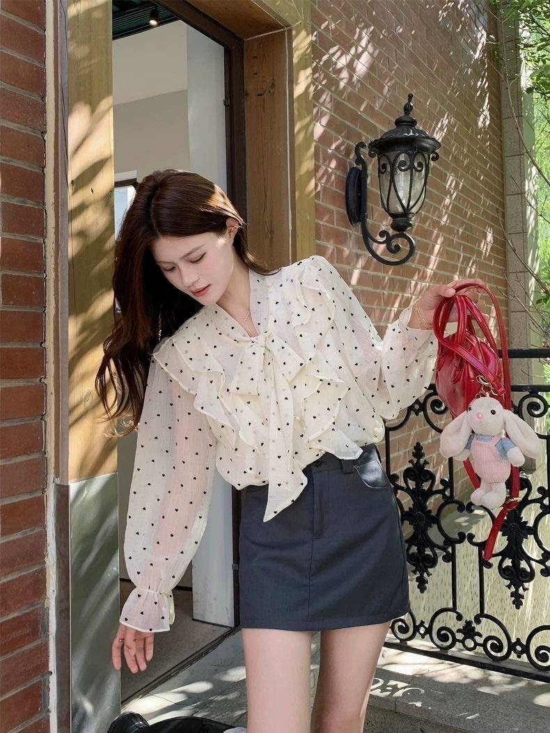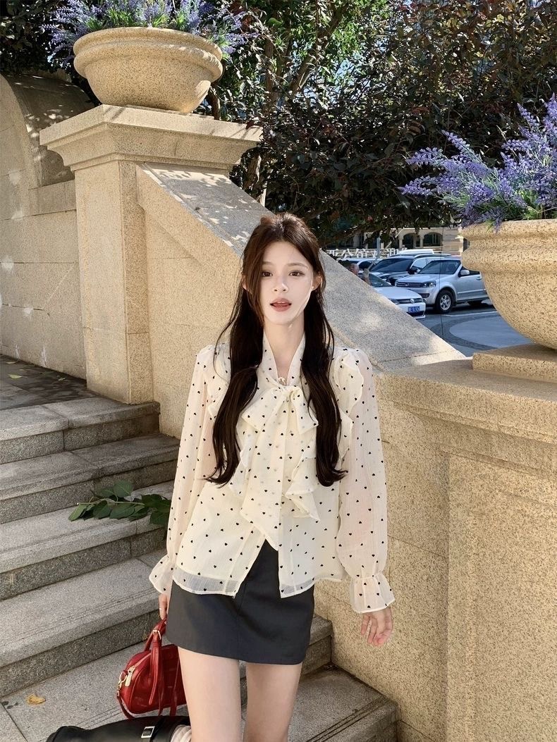 프랑스 스타일 하이 엔드 러플 웨이브 도트 셔츠 여성의 봄과 가을 새로운 디자인 센스 스트랩 셔츠 루즈 틱 탑스토어 가기
