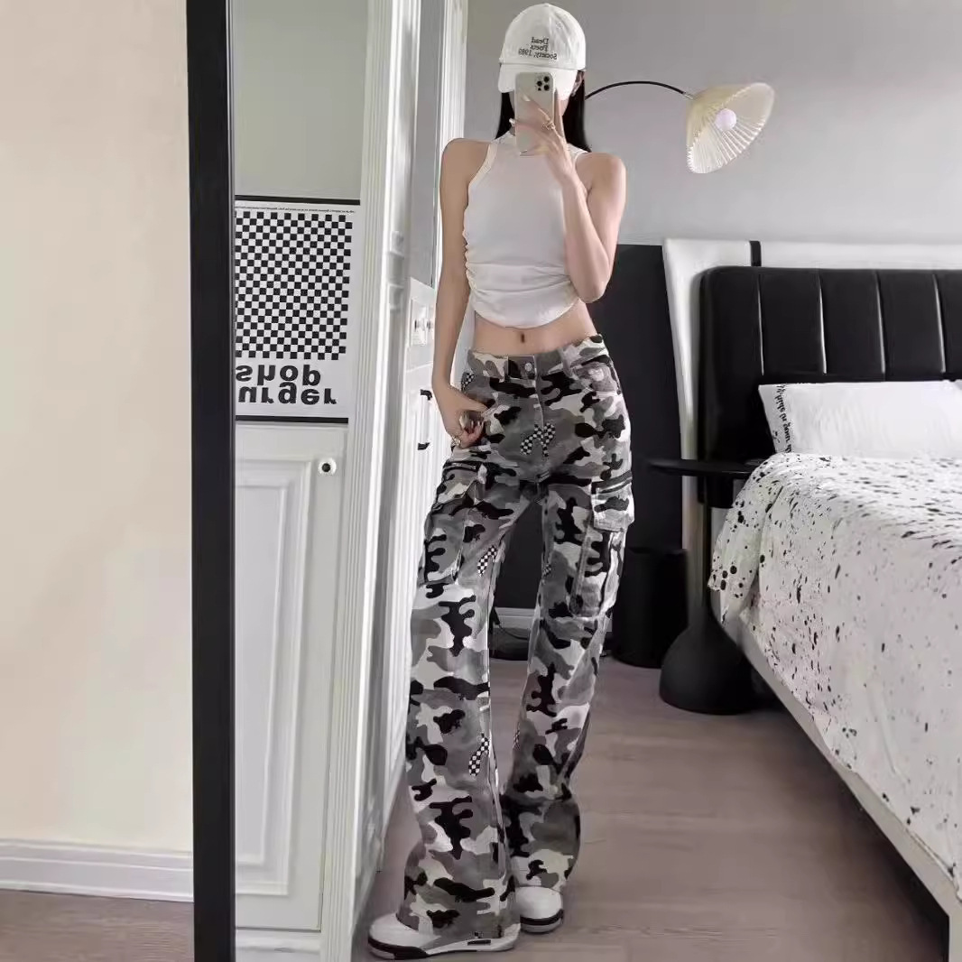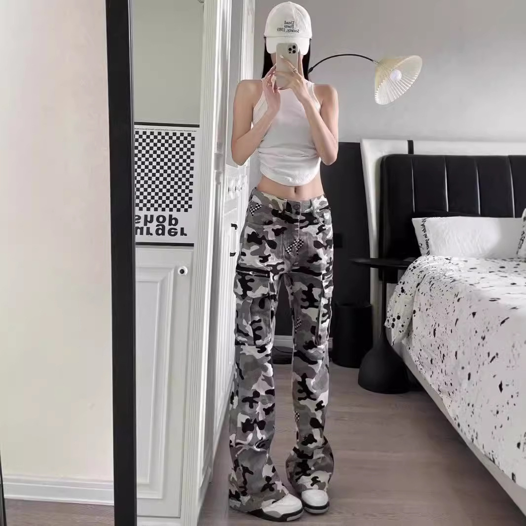 美式高街多口袋休闲迷彩裤男微喇显瘦复古拖地时尚工装垂感长裤潮