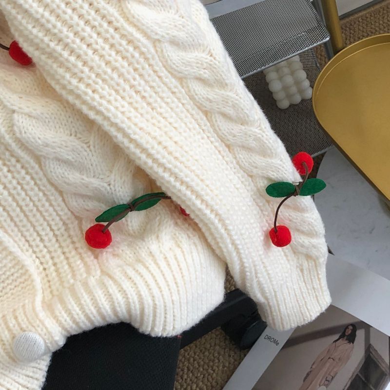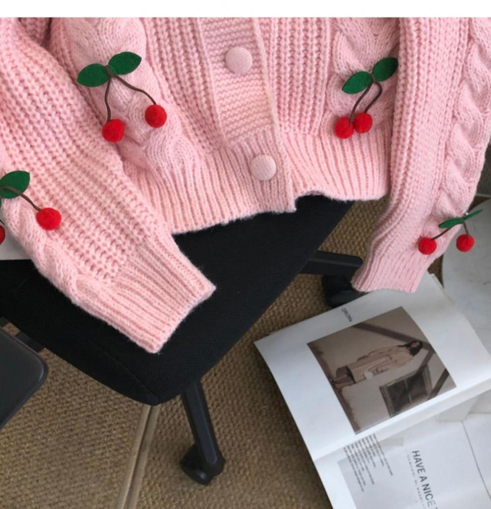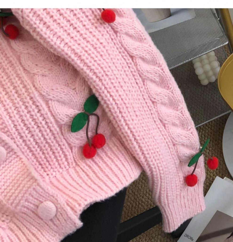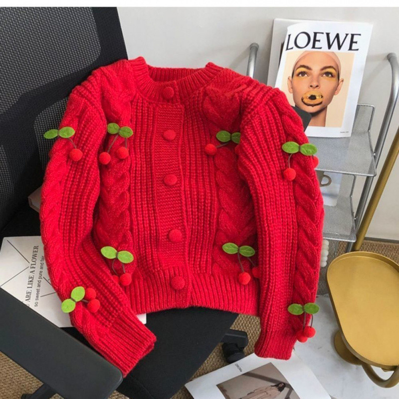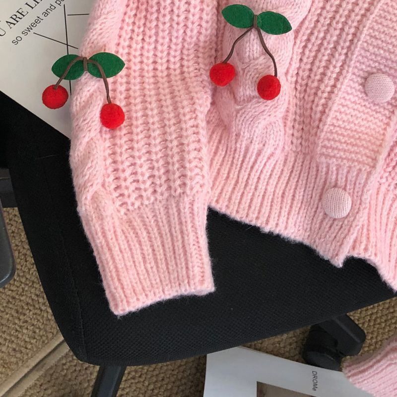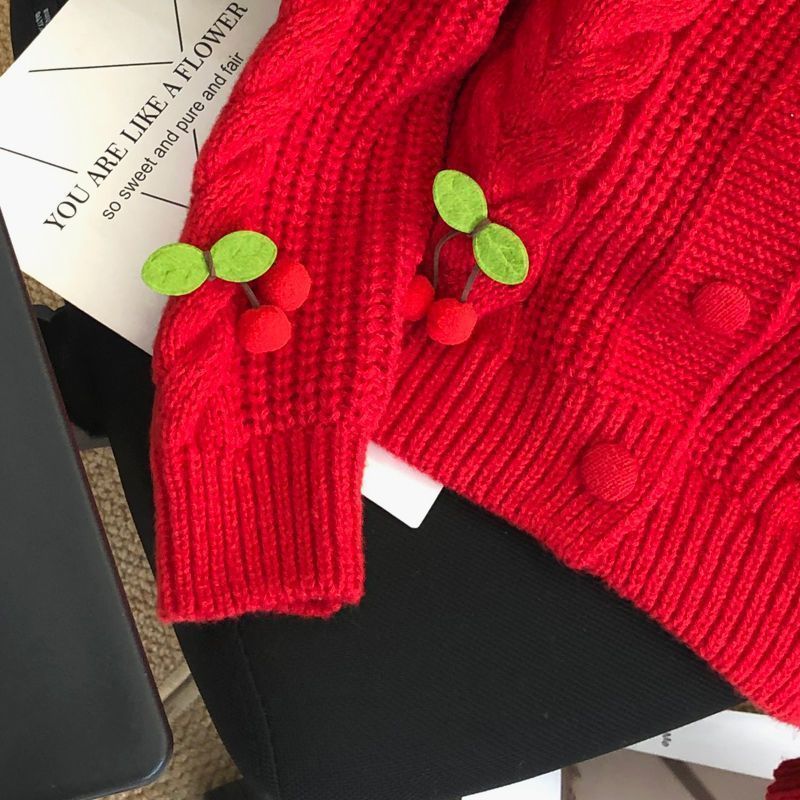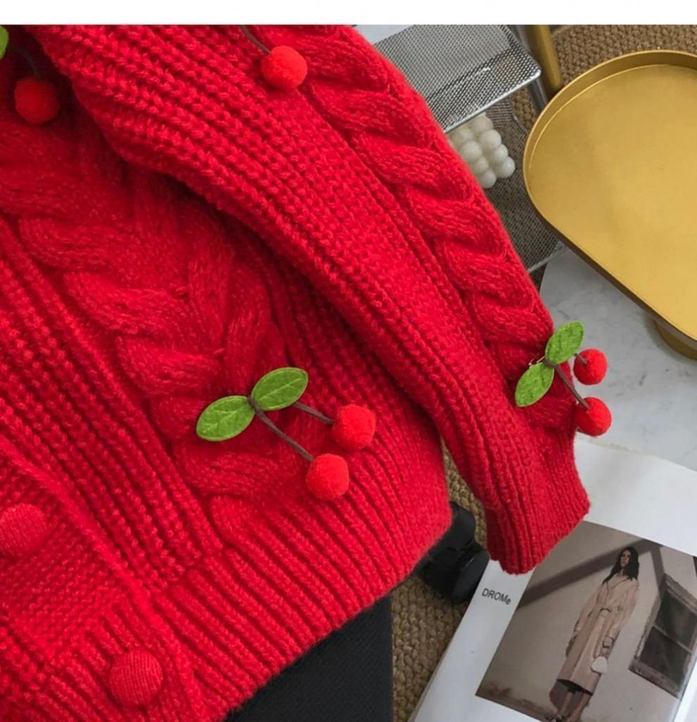 A6C 레트로 달콤한 우아한 니트 스웨터 카디건 프랑스 슬리밍 트위스트 스웨터 3 차원 체리 싱글 브레스트