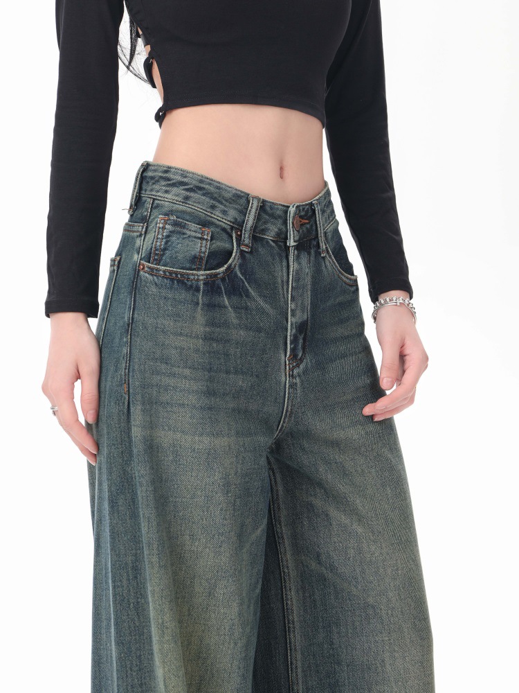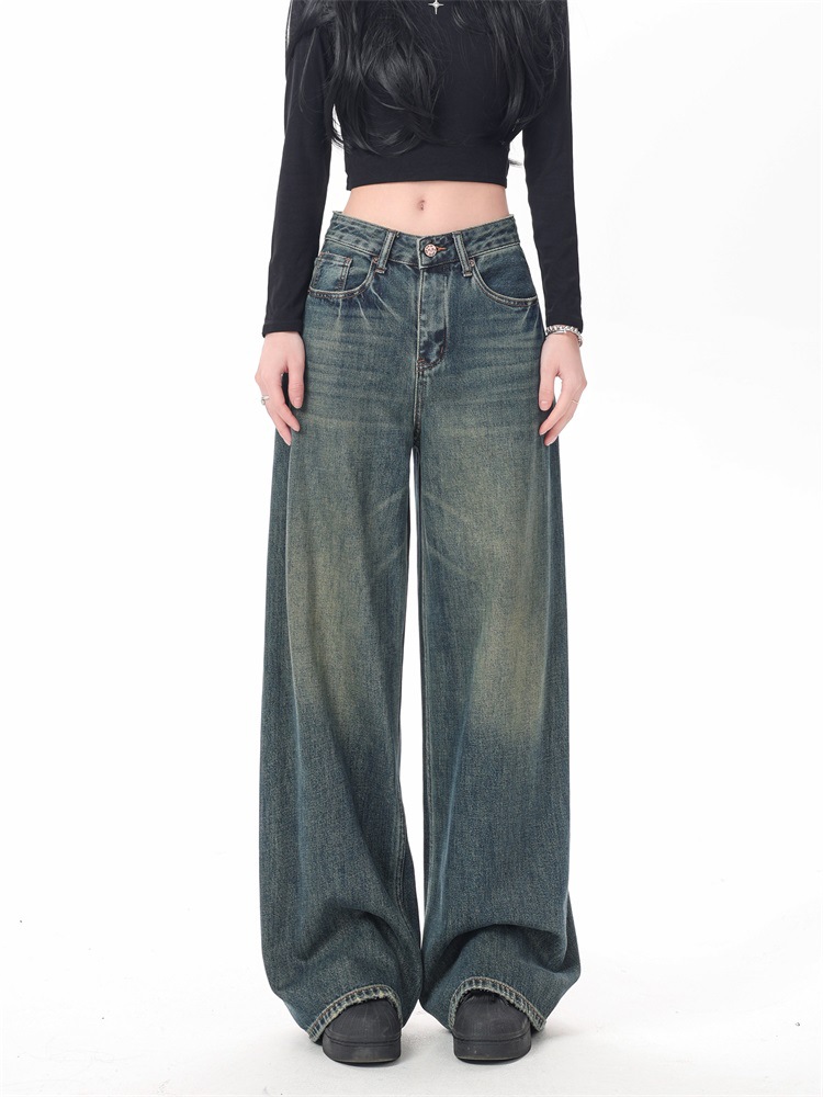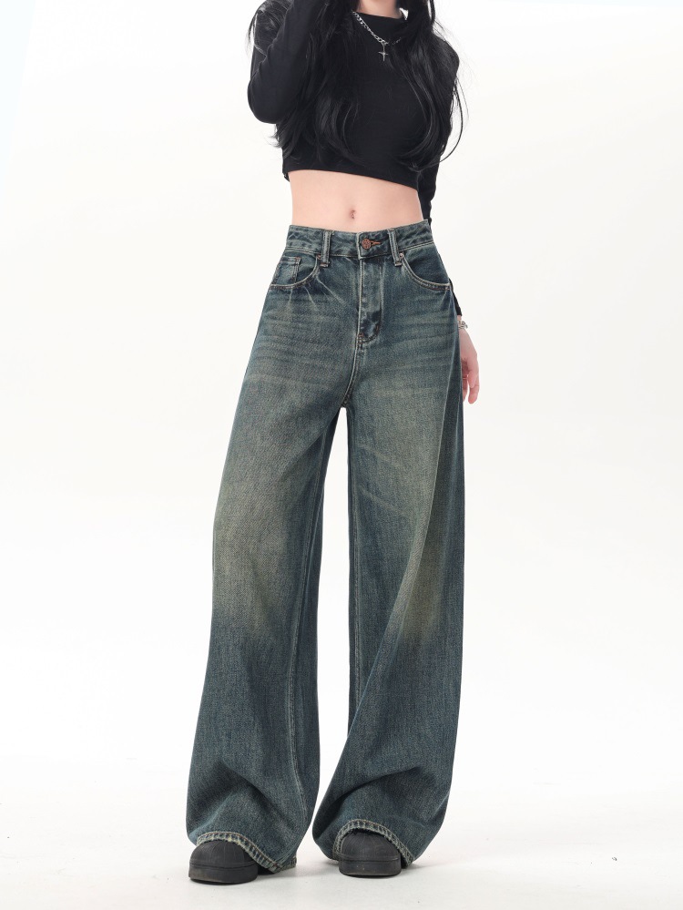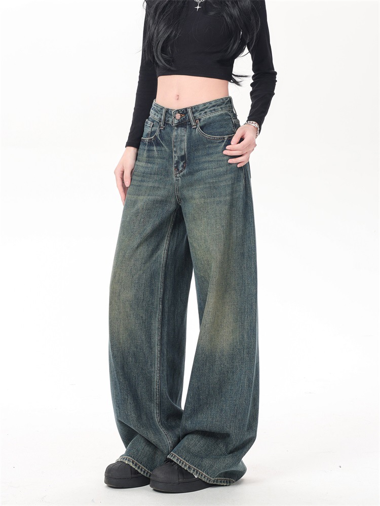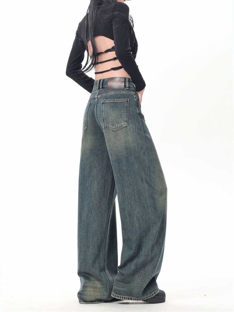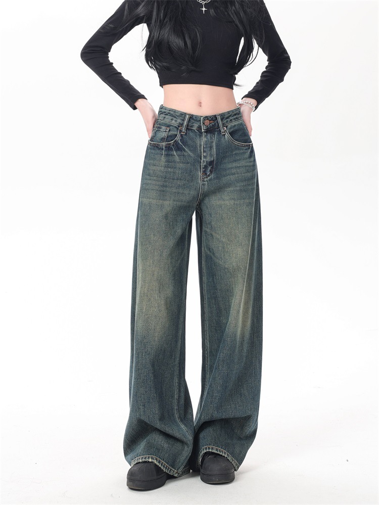 향수 레트로 아메리칸 스타일 와이드 레그 청바지 여성의 느슨한 슬리밍 높은 허리 2025 봄과 가을 새로운 직선 다리 바지스토어 가기