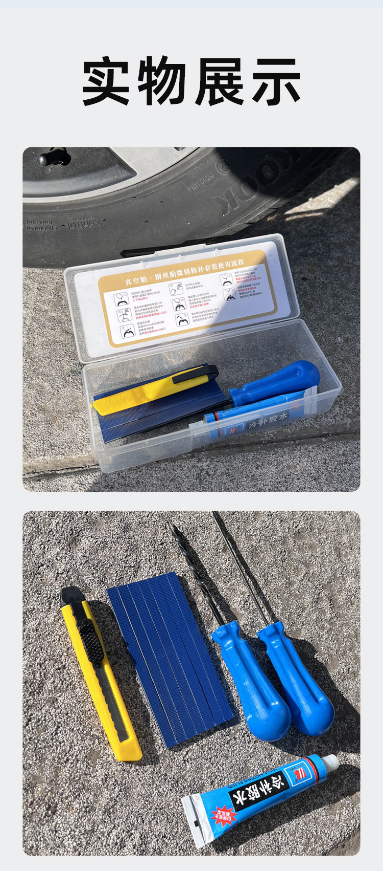 • 대형 튜브리스 타이어 비상 수리 키트 + 접착제 2개 + 접착 스트립 10개