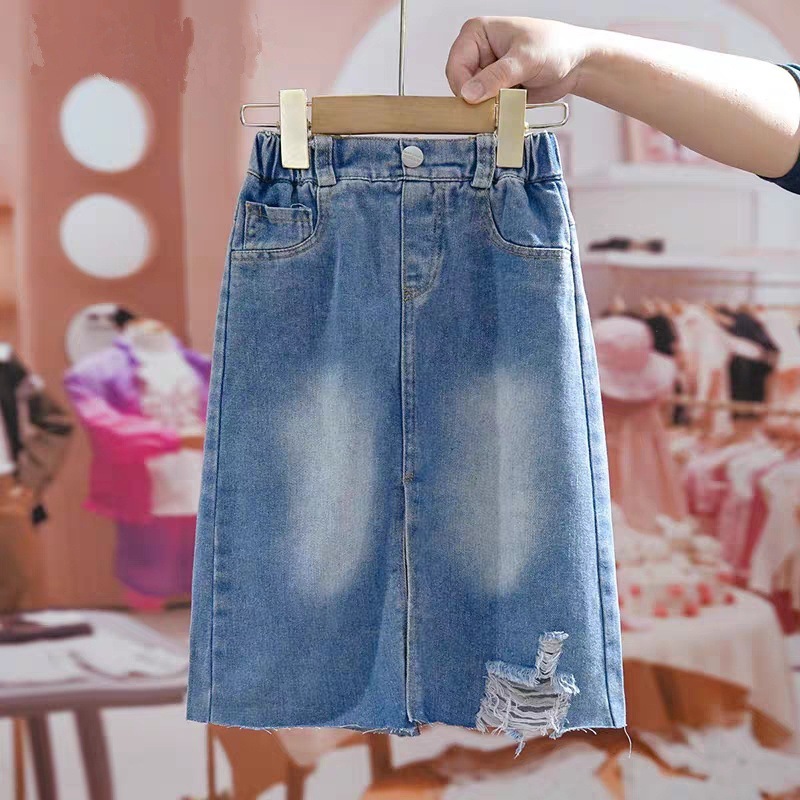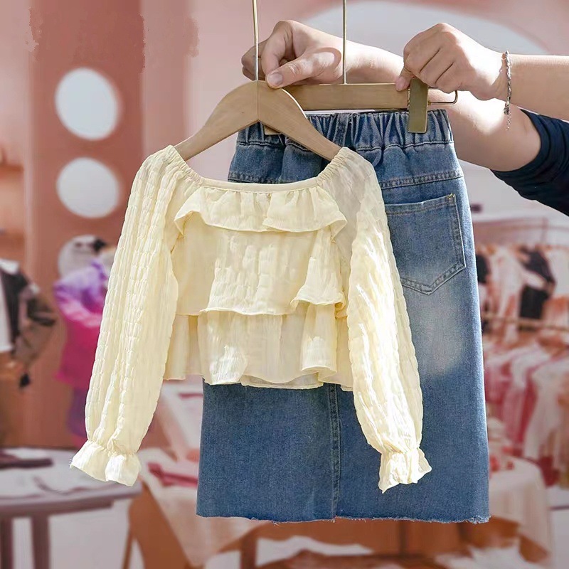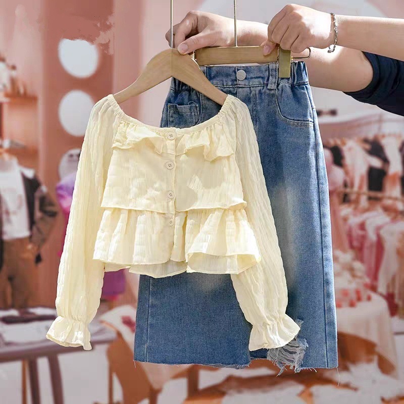 소녀의 봄과 가을 세트 2025 새로운 세련된 폭발 셔츠 3 세 소녀 세트 유행 데님 치마스토어 가기