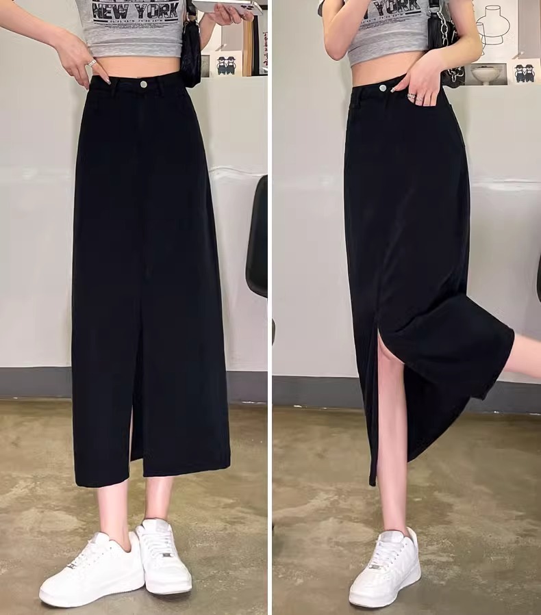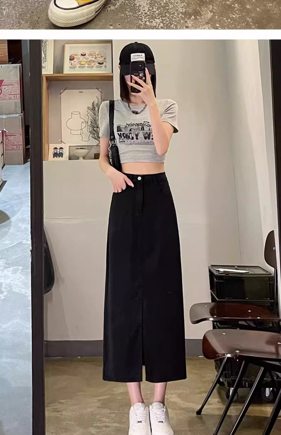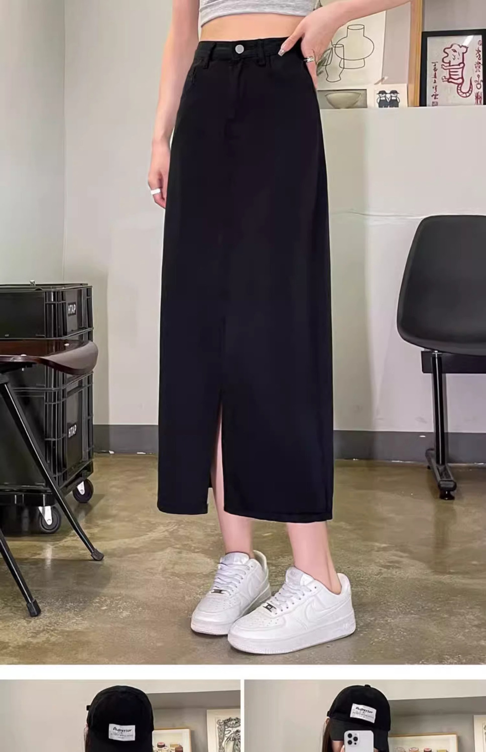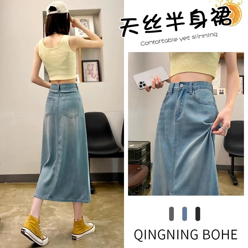 텐셀 데님 스커트 여자 여름 얇은 분할 복고풍 높은 허리 아이스 실크 중간 길이의 칼집 치마스토어 가기