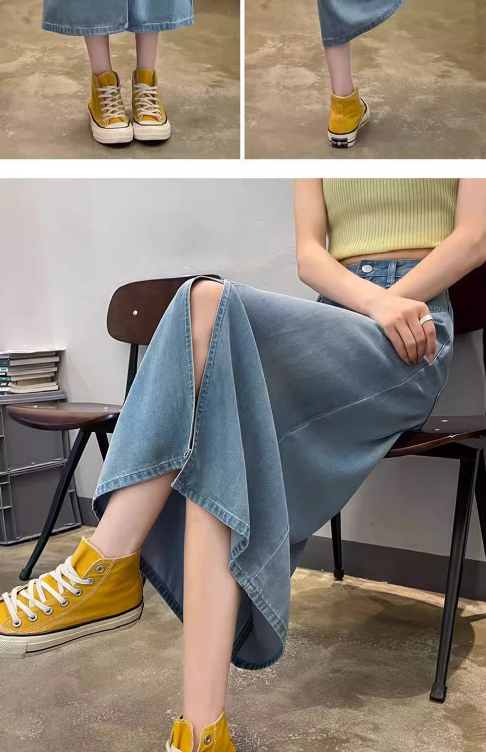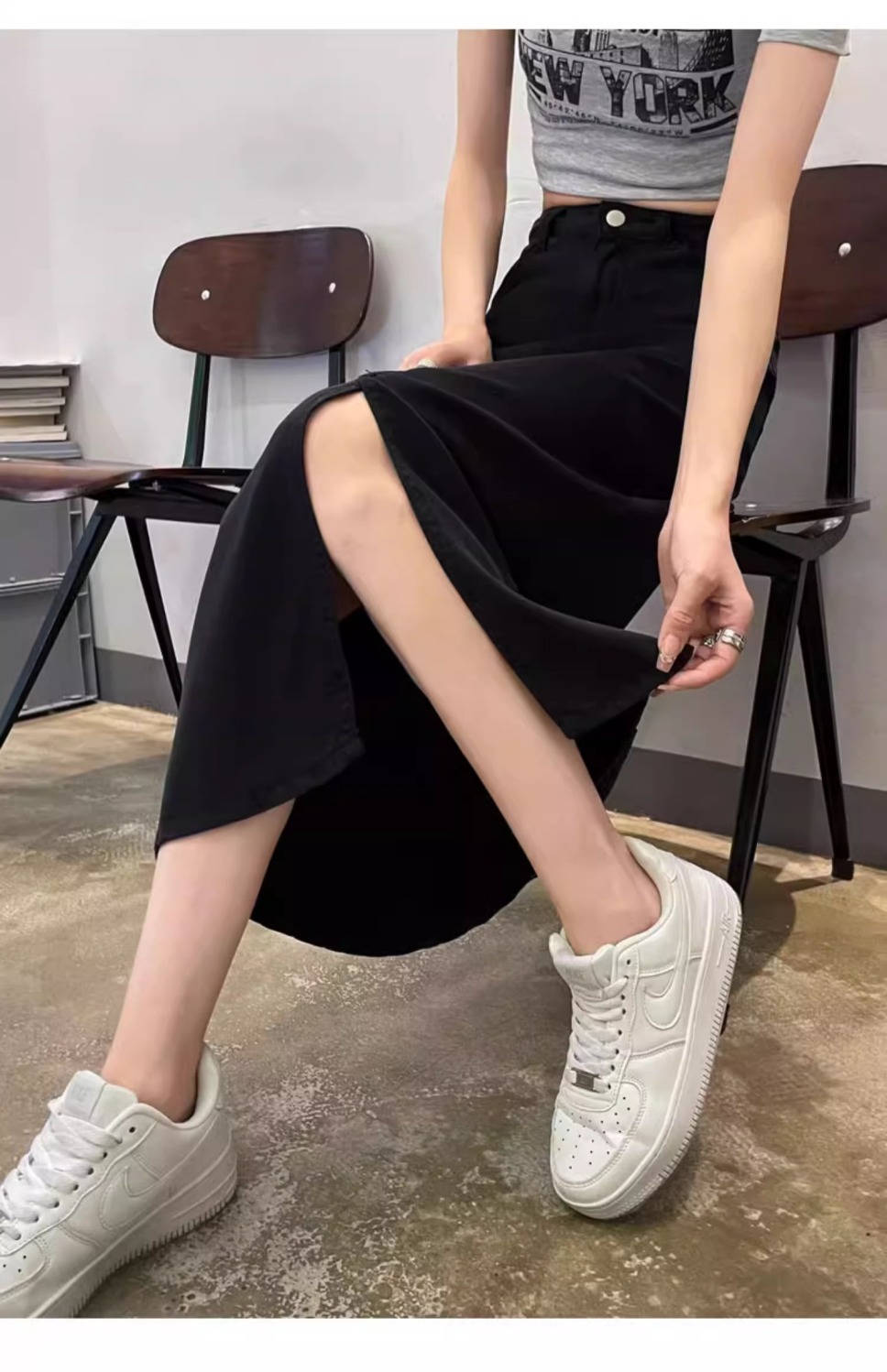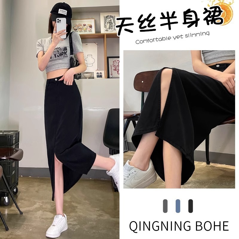 텐셀 데님 스커트 여자 여름 얇은 분할 복고풍 높은 허리 아이스 실크 중간 길이의 칼집 치마