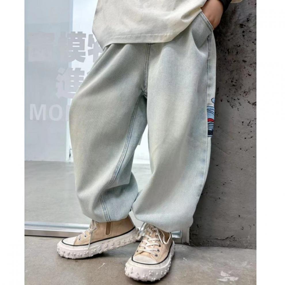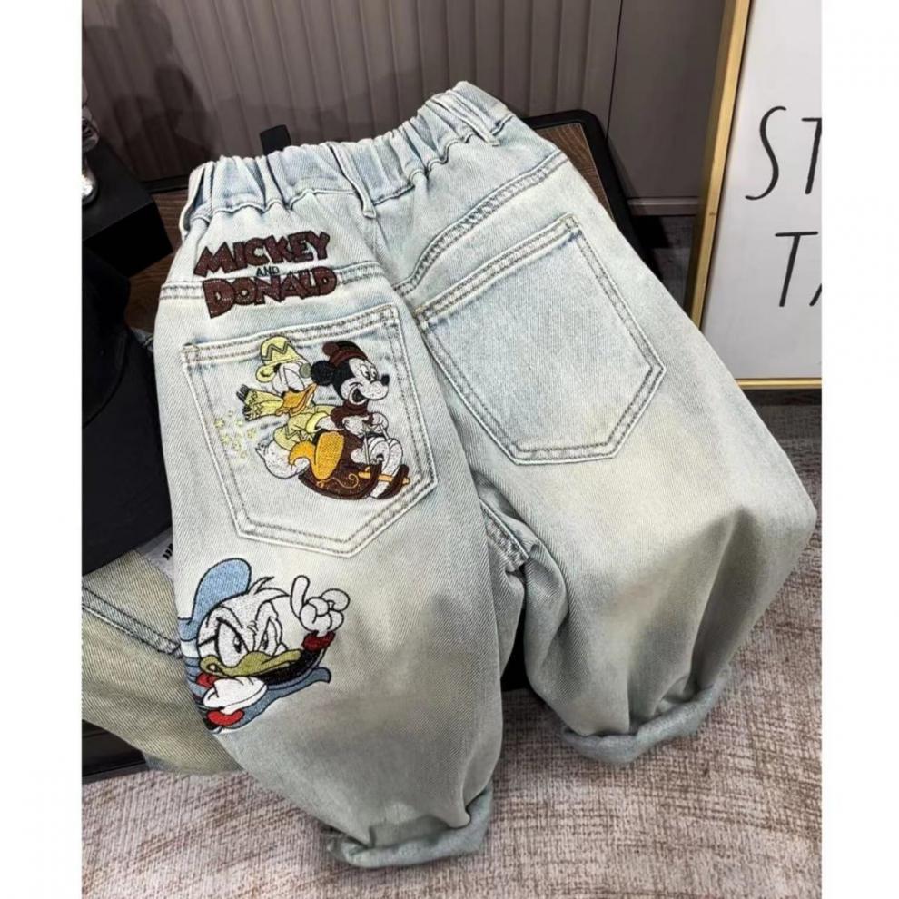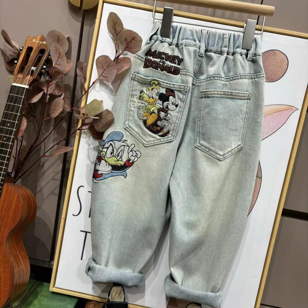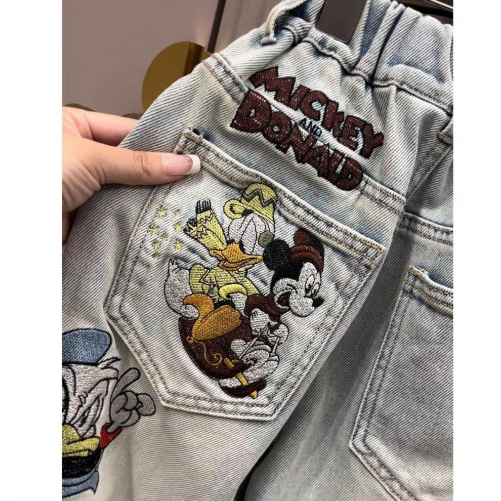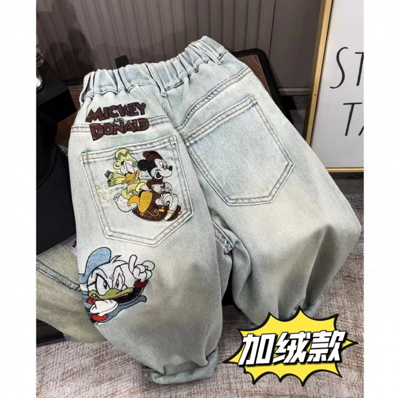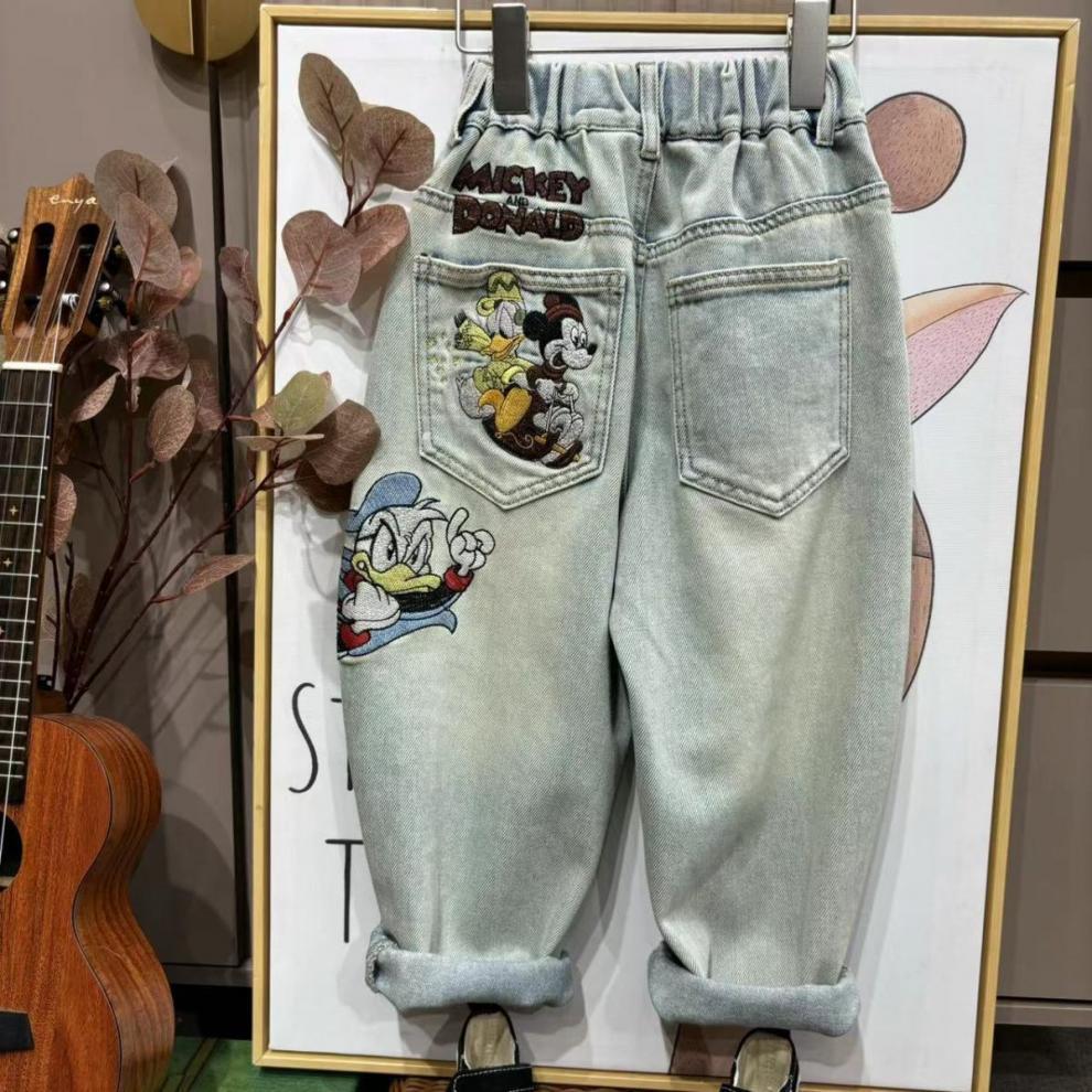 가을과 겨울 2025 소녀와 소녀를위한 자수 미키 만화 바지 밝은 색 진정한 오스트리아 곡물 양털 청바지 스트레칭스토어 가기