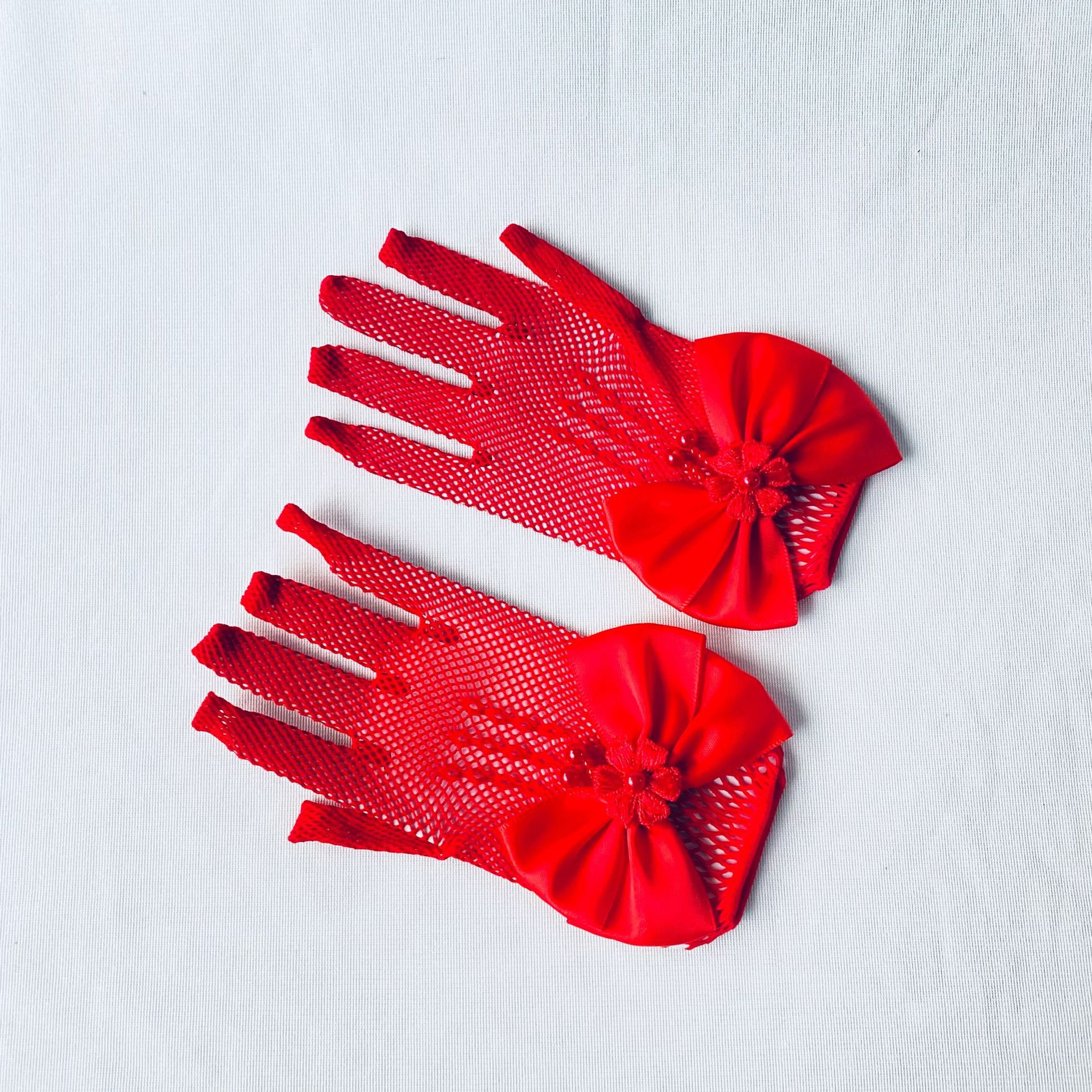 • 어린이용 리본 장식 망사 탄력 장갑 (레드)