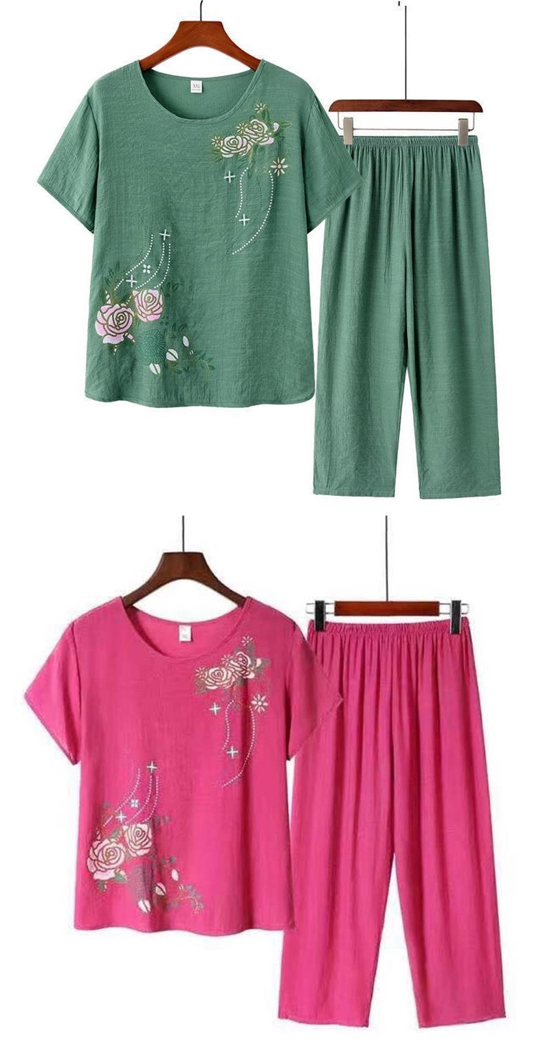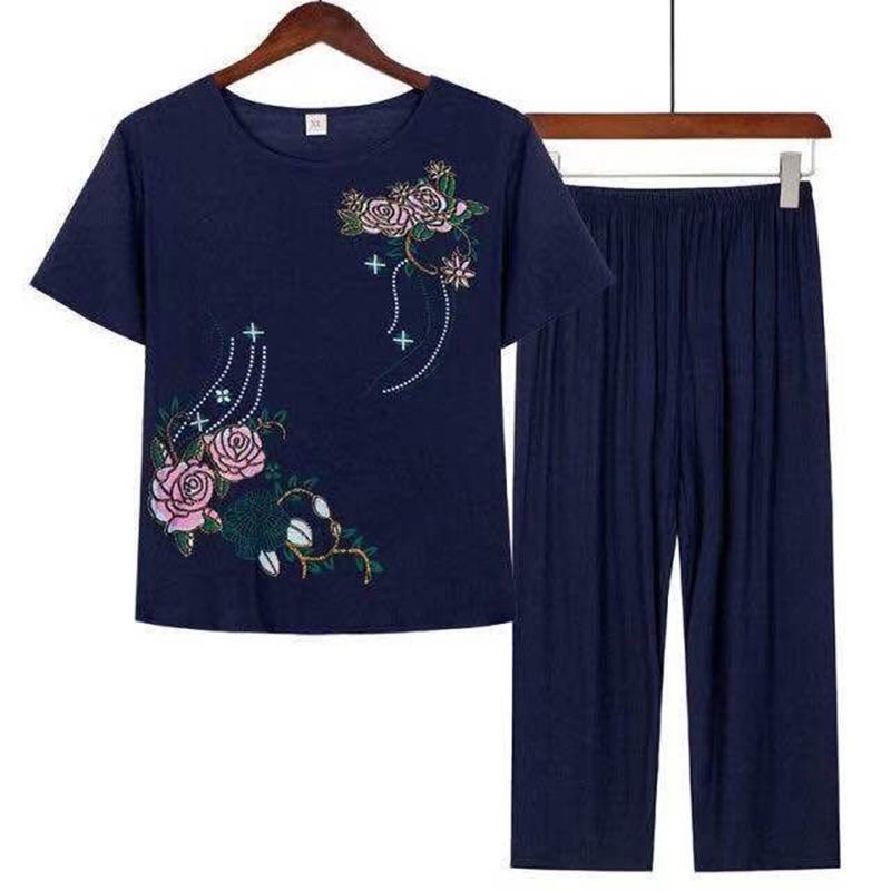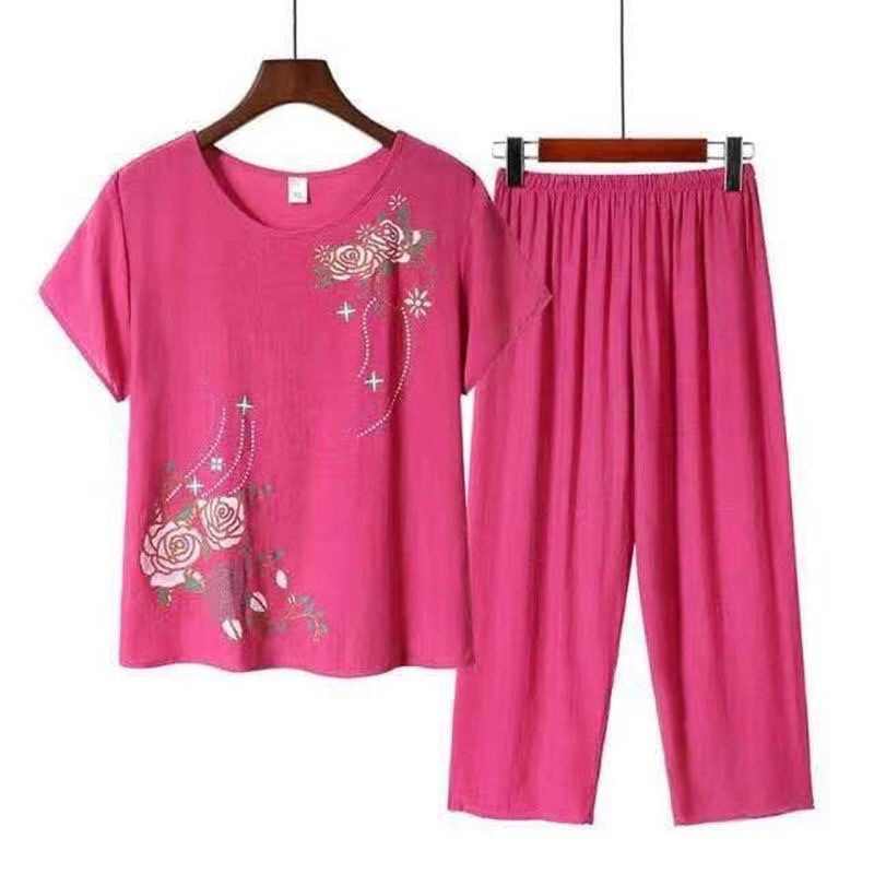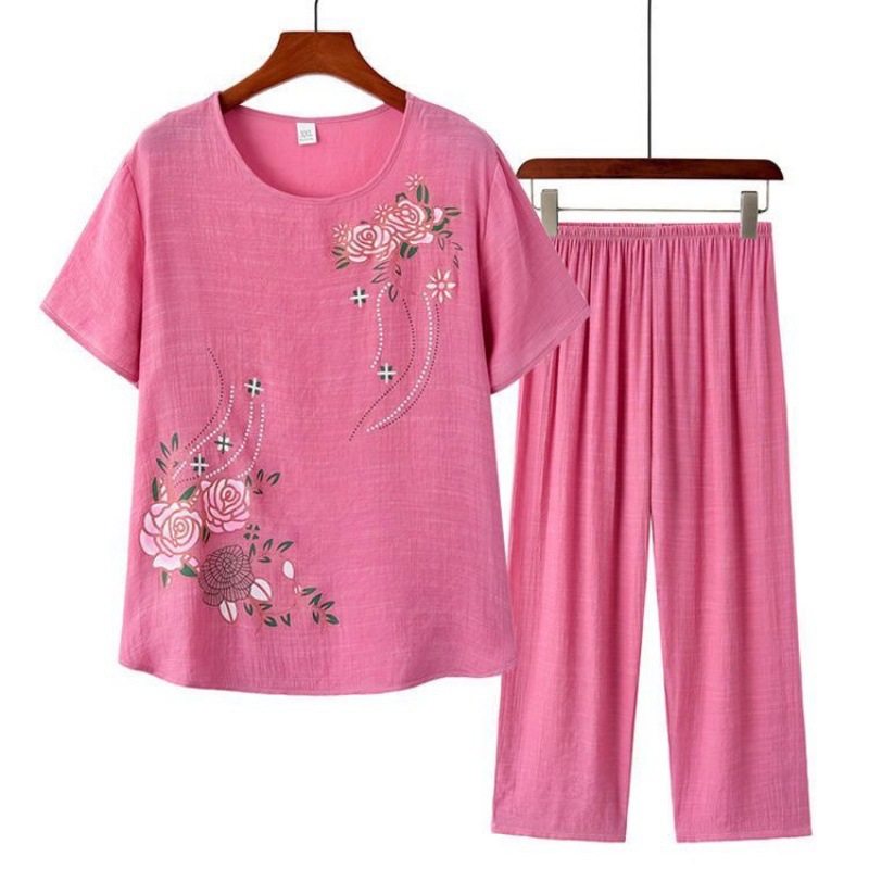 중년 및 노인 여성 티셔츠 여름 모조면과 린넨 어머니의 투피스 세트 시어머니 60 세 70 세 할머니 티셔츠 바지스토어 가기