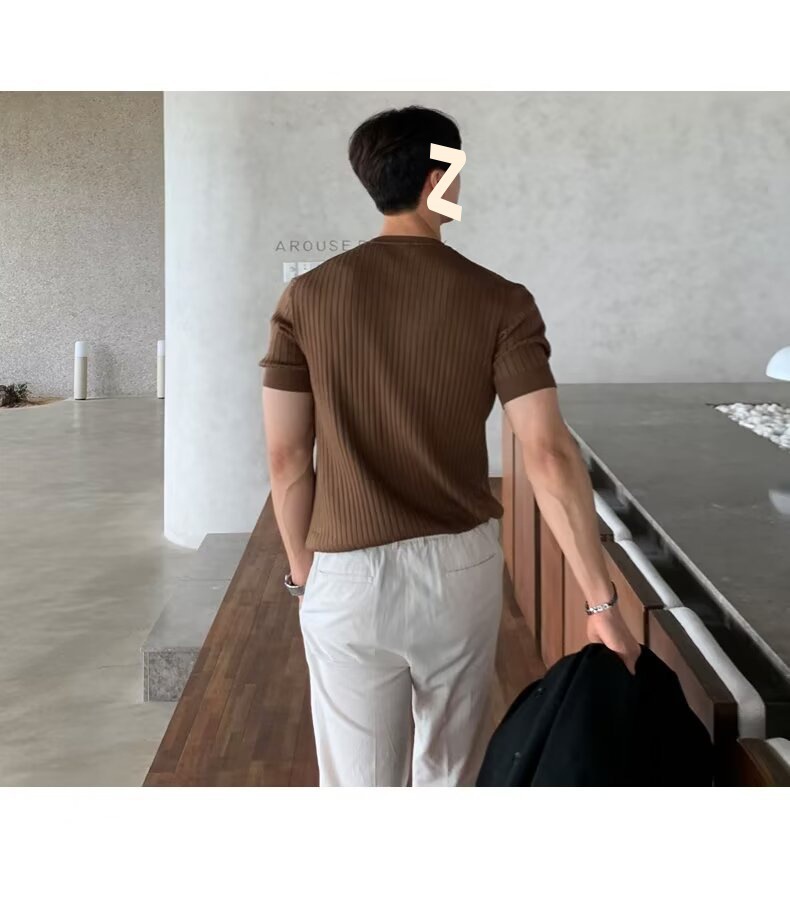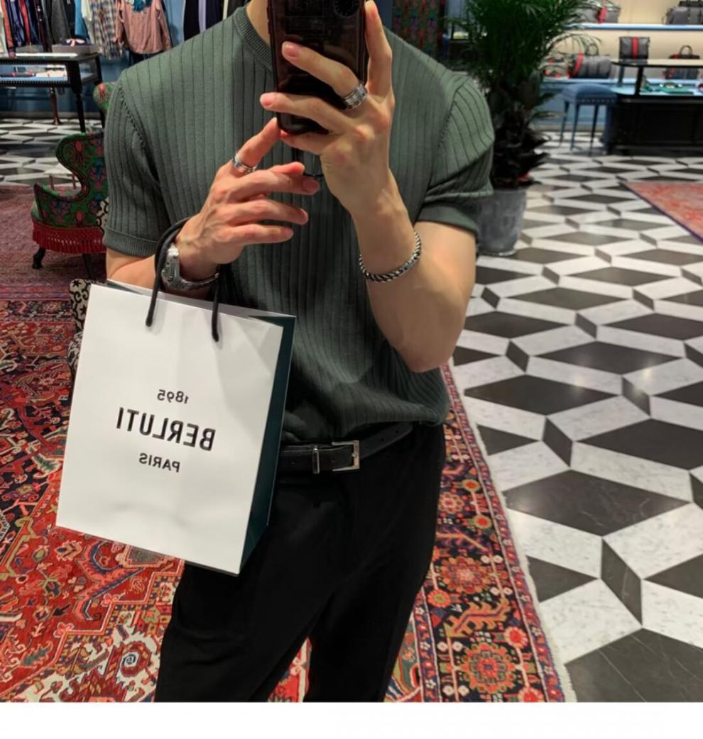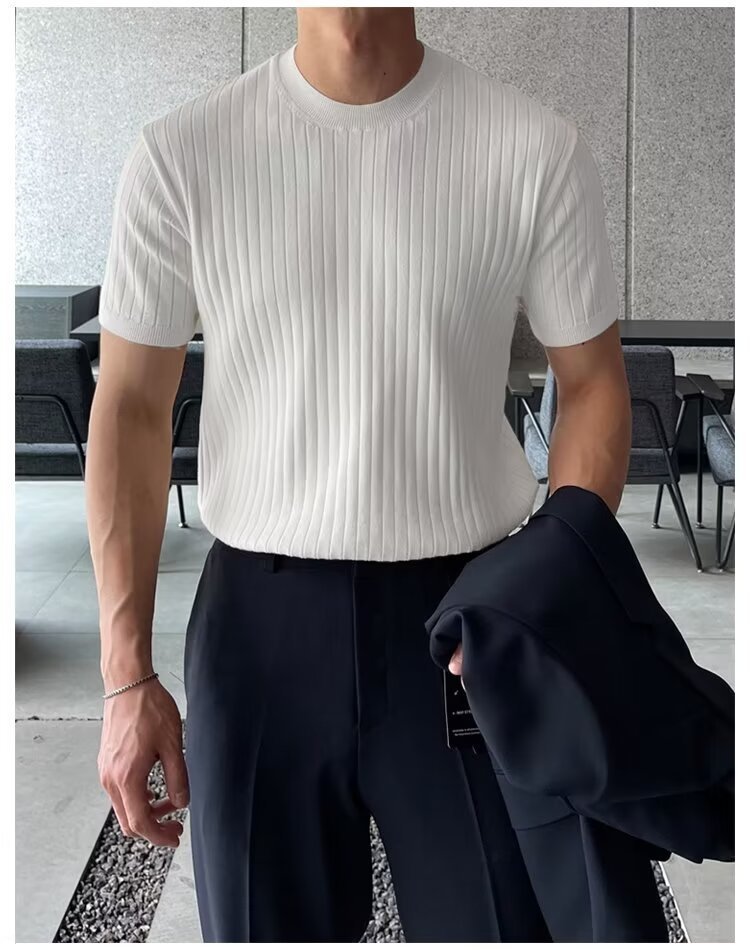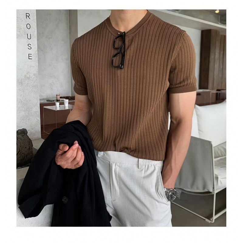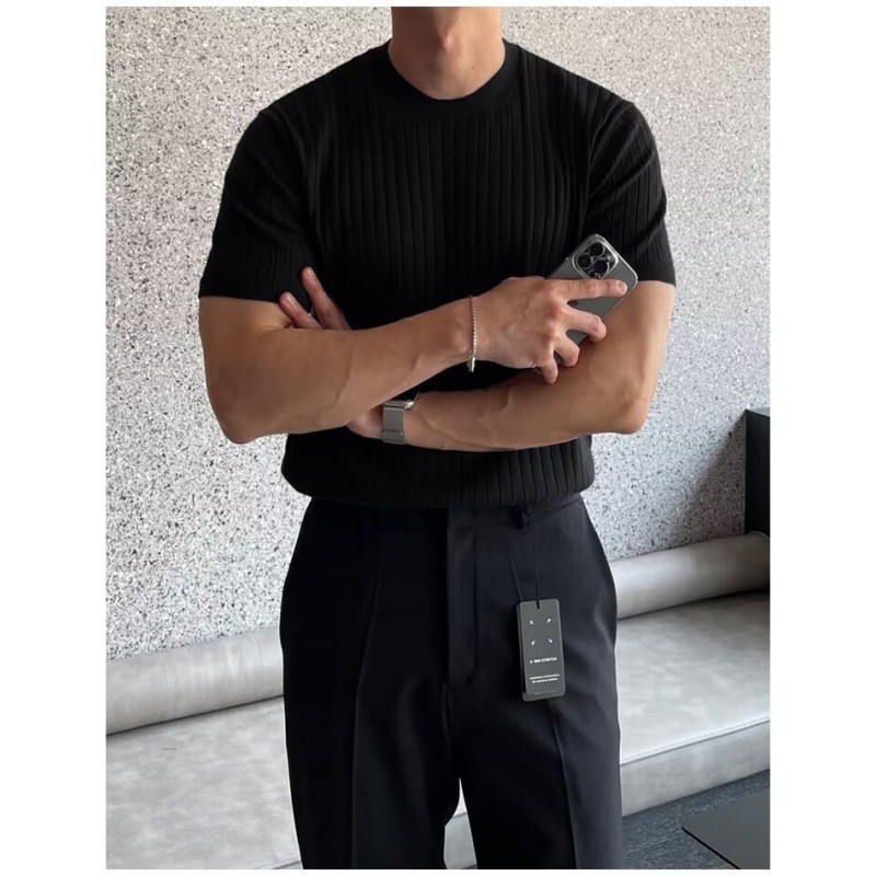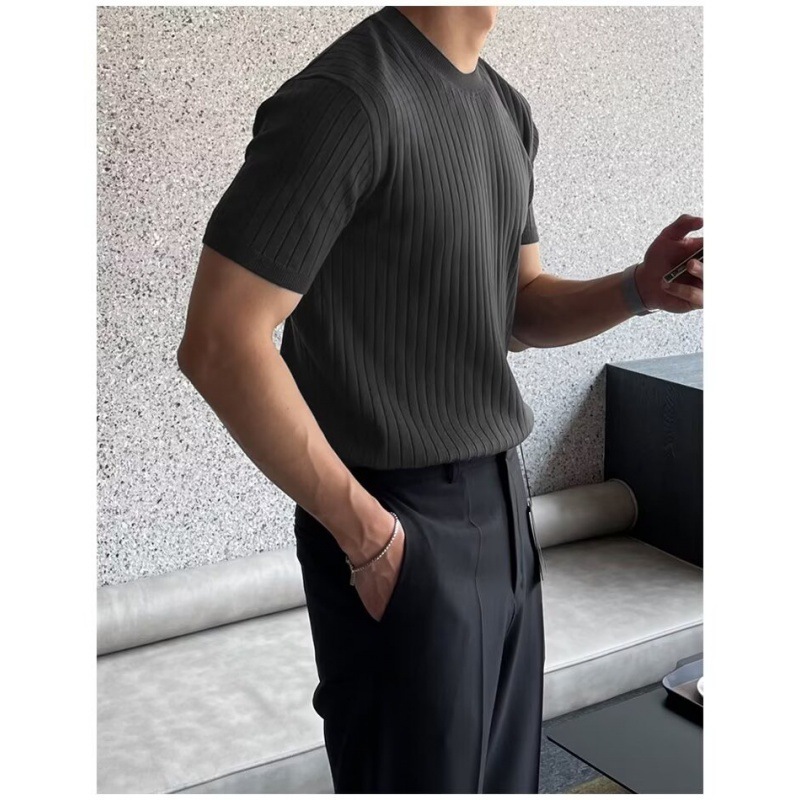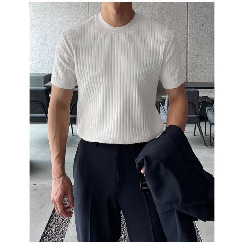 여름 얇은 둥근 목 반팔 스웨터 남성용 슬림 핏 스트레치 트렌디 올매치 디자인 센스 수직 스트라이프 반소매 티셔츠스토어 가기