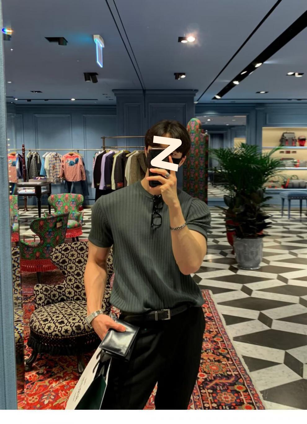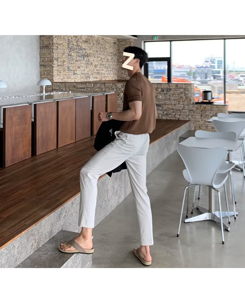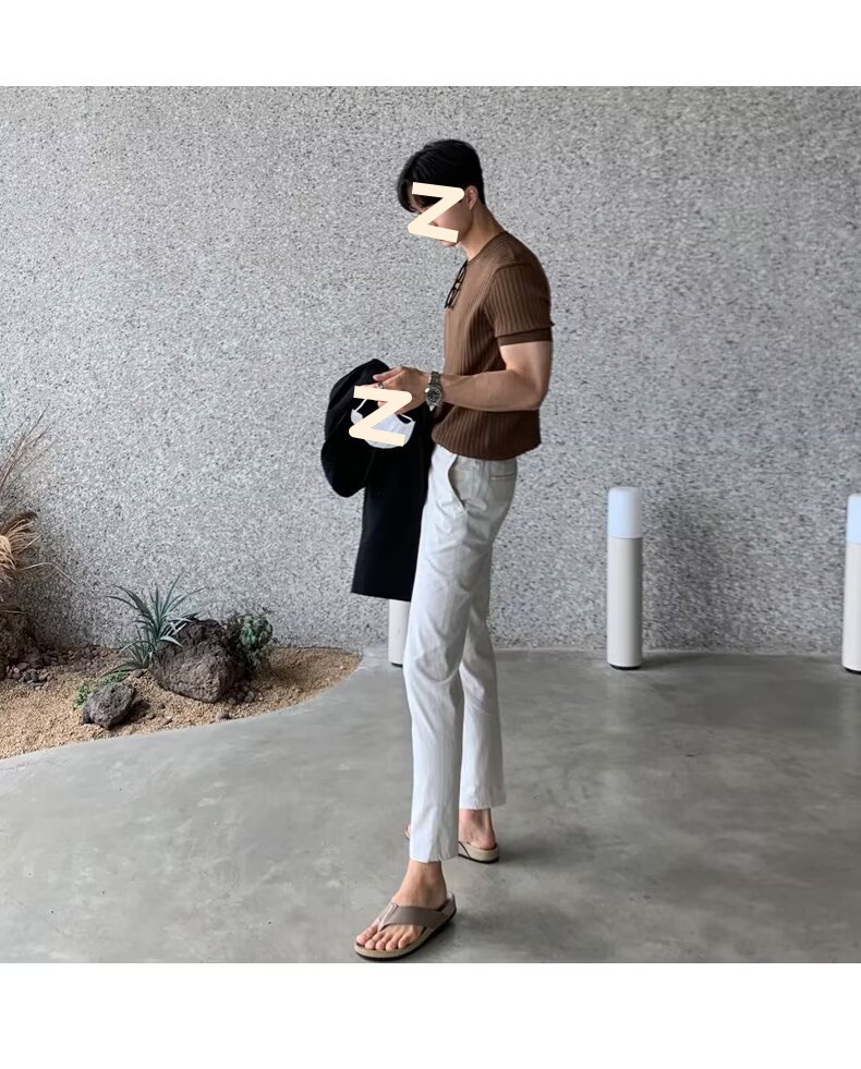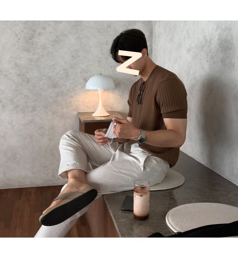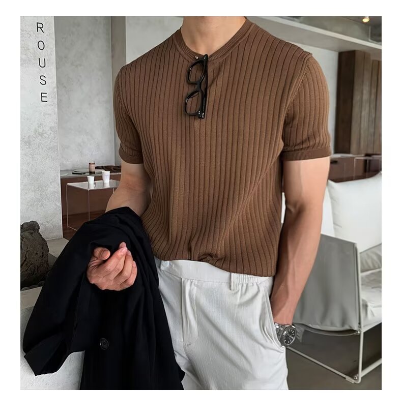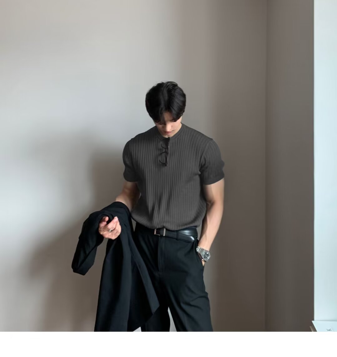 여름 얇은 둥근 목 반팔 스웨터 남성용 슬림 핏 스트레치 트렌디 올매치 디자인 센스 수직 스트라이프 반소매 티셔츠스토어 가기