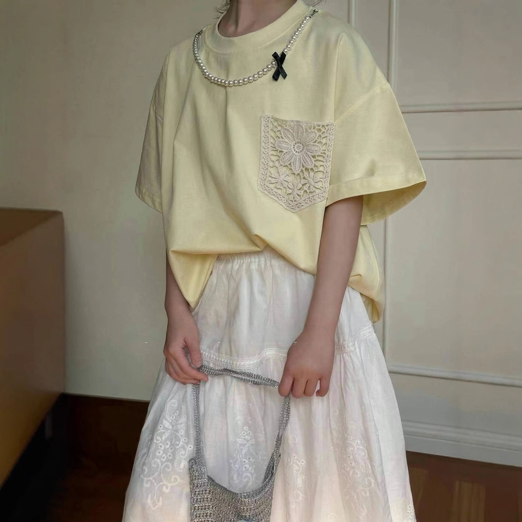 여자 여름 반팔 어린이 티셔츠 투피스 세트 2025 새로운 한국 스타일 서양식 중대형 어린이 레이스 포켓 인터넷 인기스토어 가기