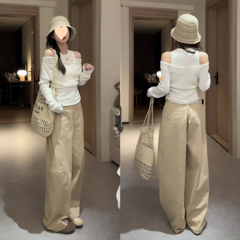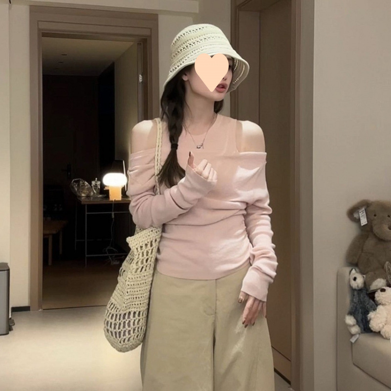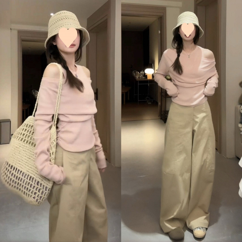 2025 봄 시대 감소 한국웨어 세트 가짜 투피스 어깨 니트웨어 아름다운 시미 타르 와이드 레그 바지 투피스 세트스토어 가기