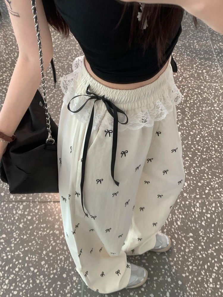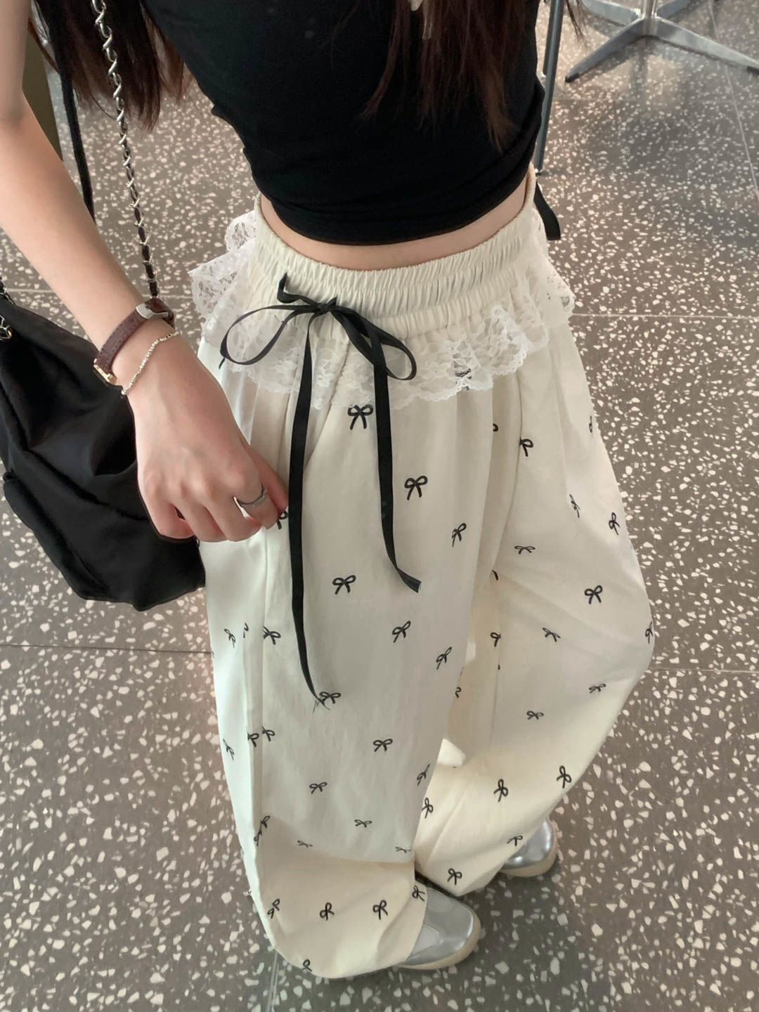 아메리칸 스타일 달콤하고 매운 레이스 스티칭 활 캐주얼 바지 여성의 여름 높은 허리 꽃 넓은 다리 바지 스트레이트 바지스토어 가기