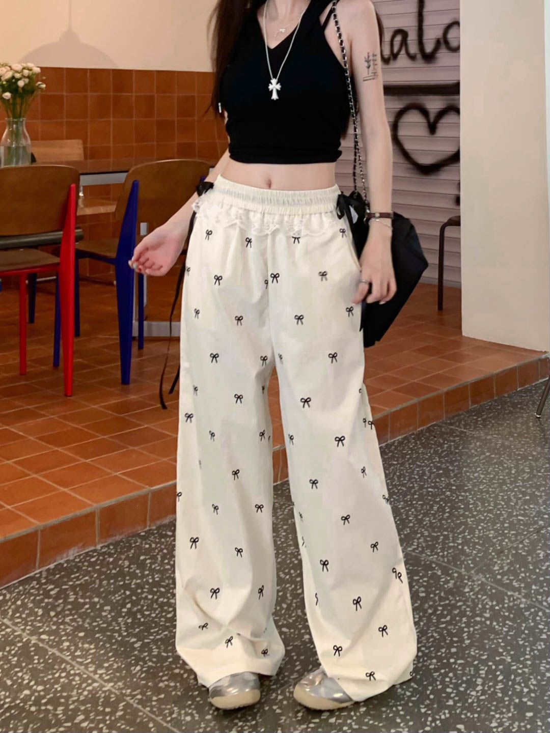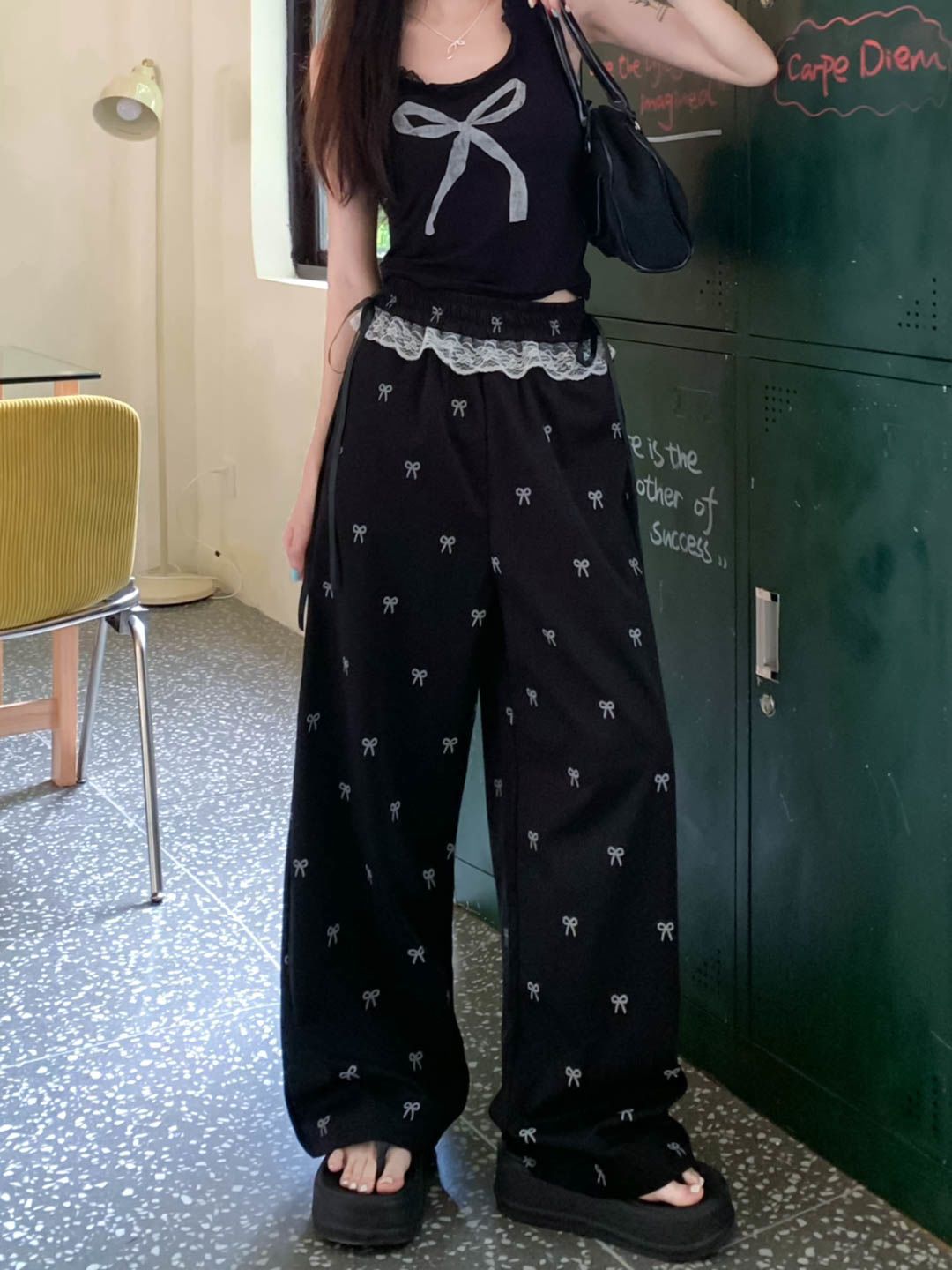 아메리칸 스타일 달콤하고 매운 레이스 스티칭 활 캐주얼 바지 여성의 여름 높은 허리 꽃 넓은 다리 바지 스트레이트 바지