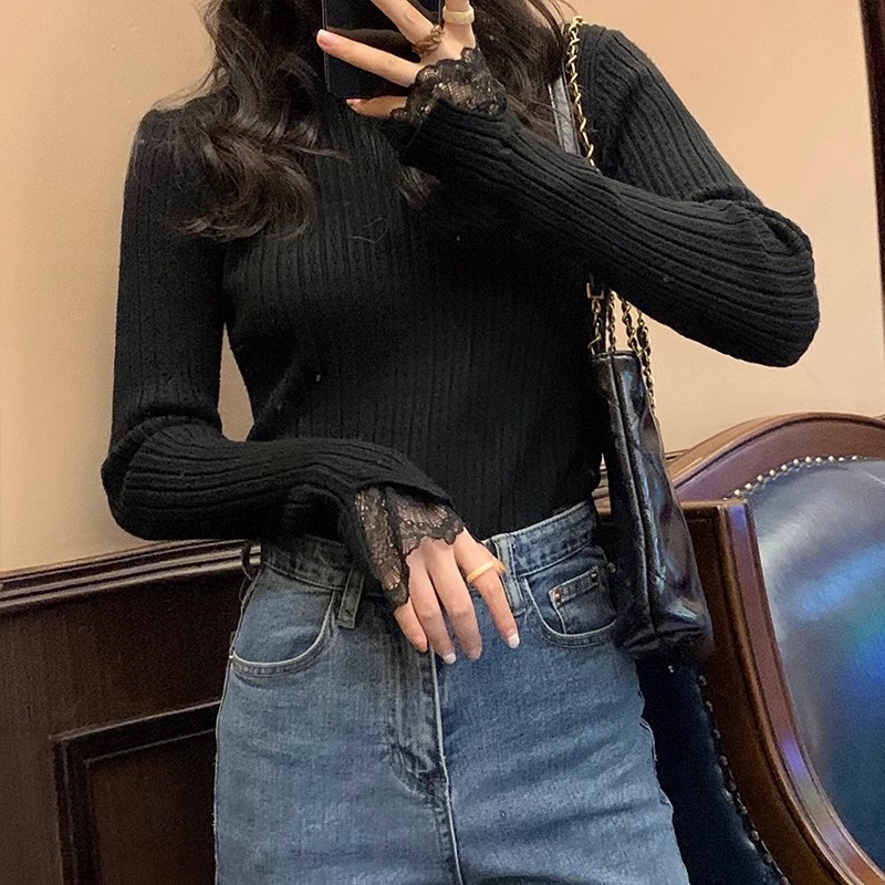 레이스베이스 셔츠 여성용 서양식 내부 하프 하이 넥 슬림 핏 스웨터 가을과 겨울 디자인 센스 미드 칼라 스웨터 탑 트렌디