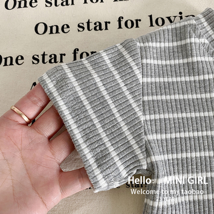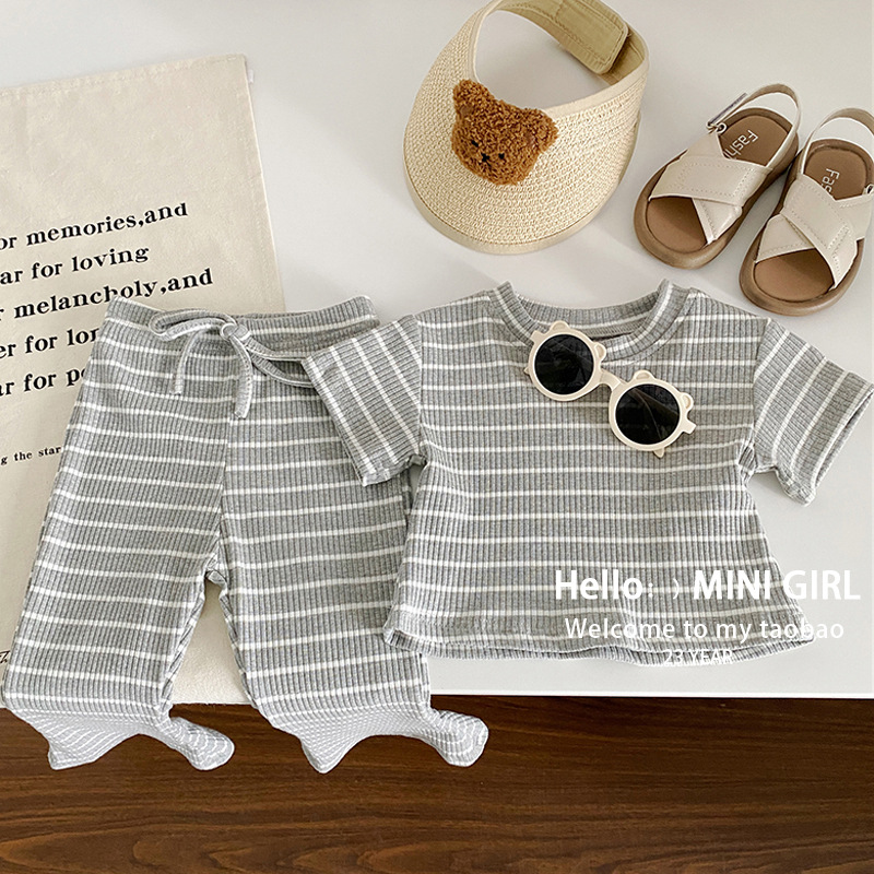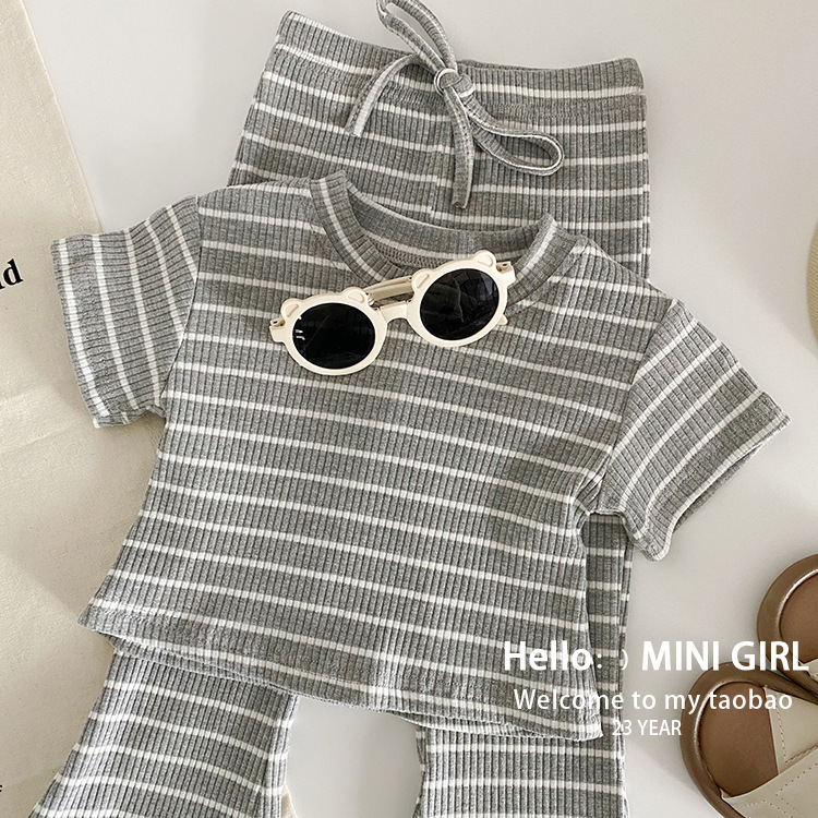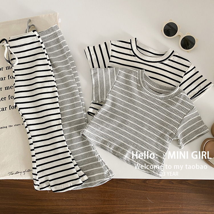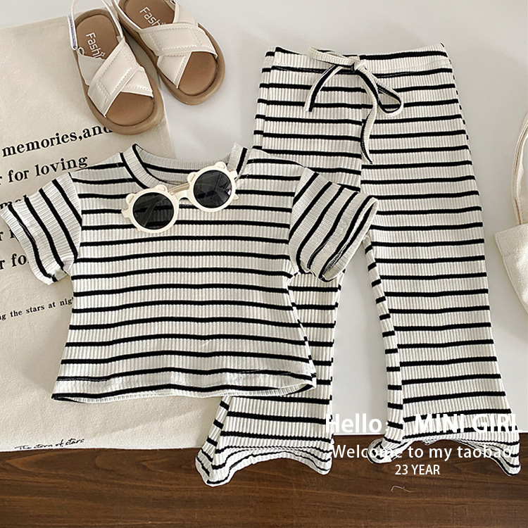 소녀 여름 서양식 줄무늬 반팔 세트 아기 소녀 구덩이 줄무늬 탑 어린이 마이크로 블레이저 바지 투피스 아동복스토어 가기