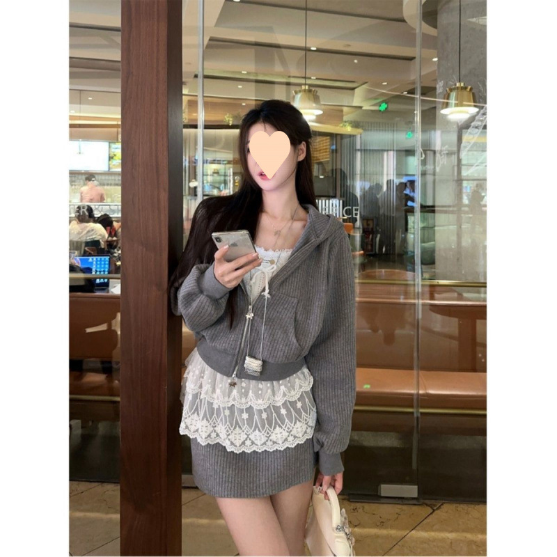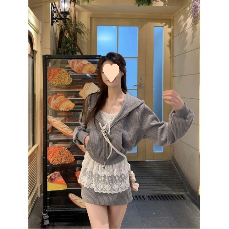 2025 뉴 그레이 후드 긴팔 재킷 여성용 내부 레이스 조끼 슬링 스프링 힙합 스커트 3 피스 세트