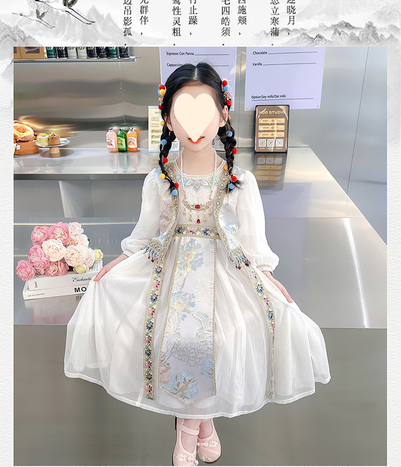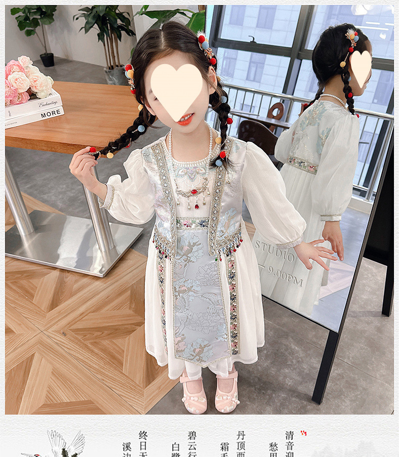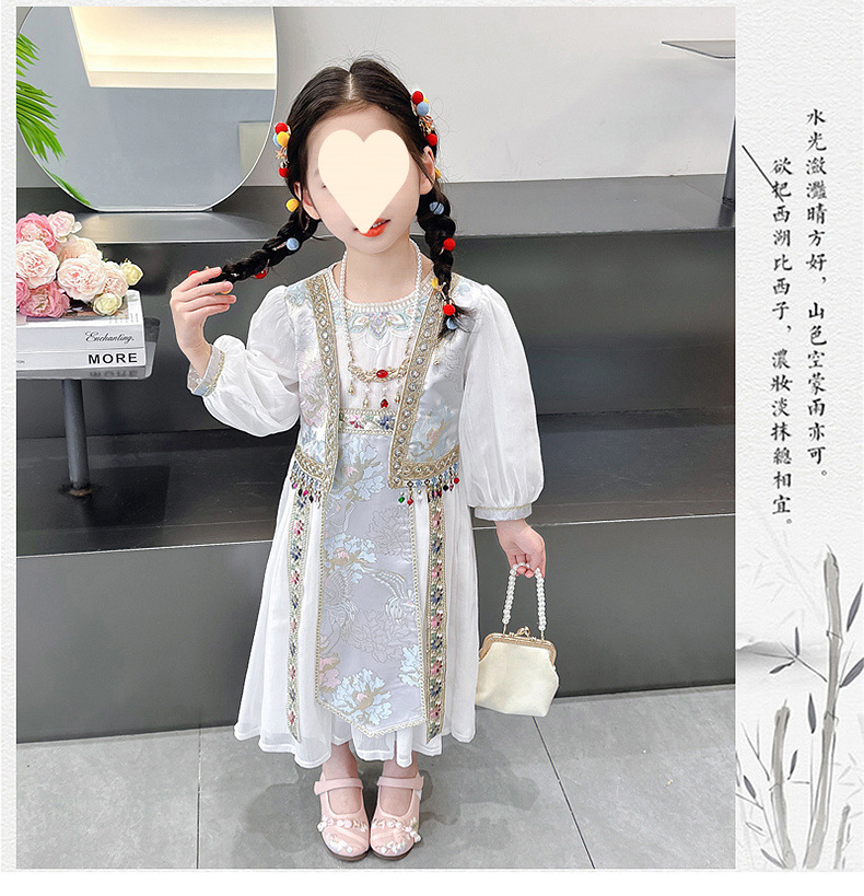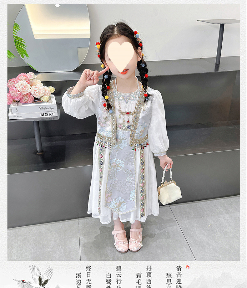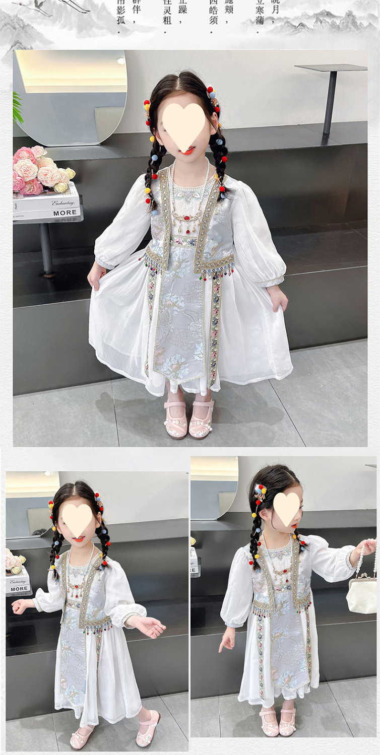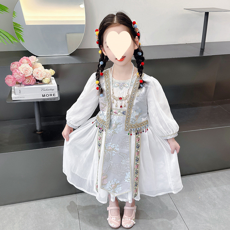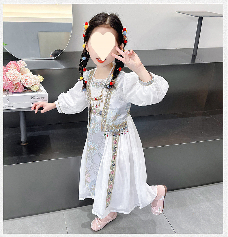소녀 원피스 세트 2024 봄 새로운 소녀 민족 스타일 원피스 복고풍 자수 가짜 투피스 세트
