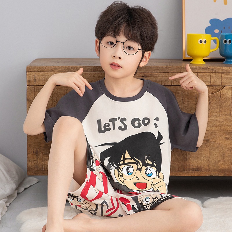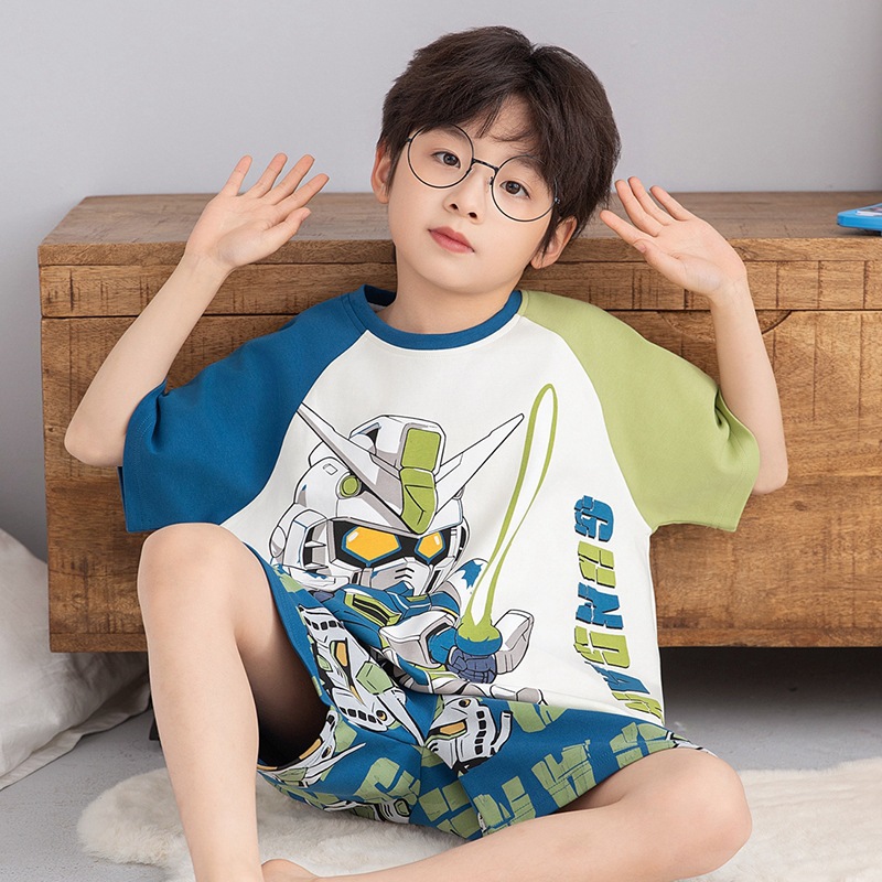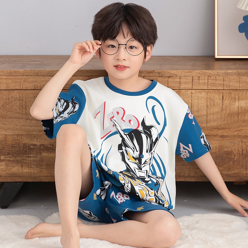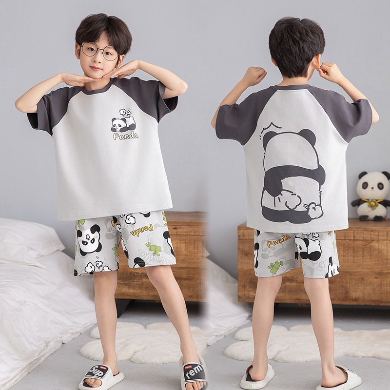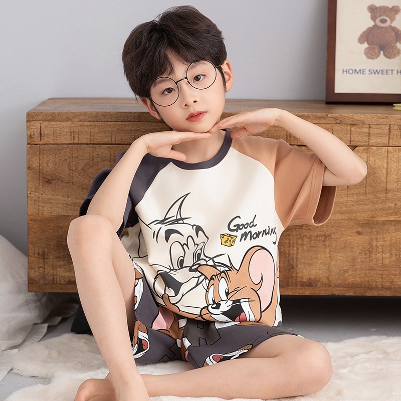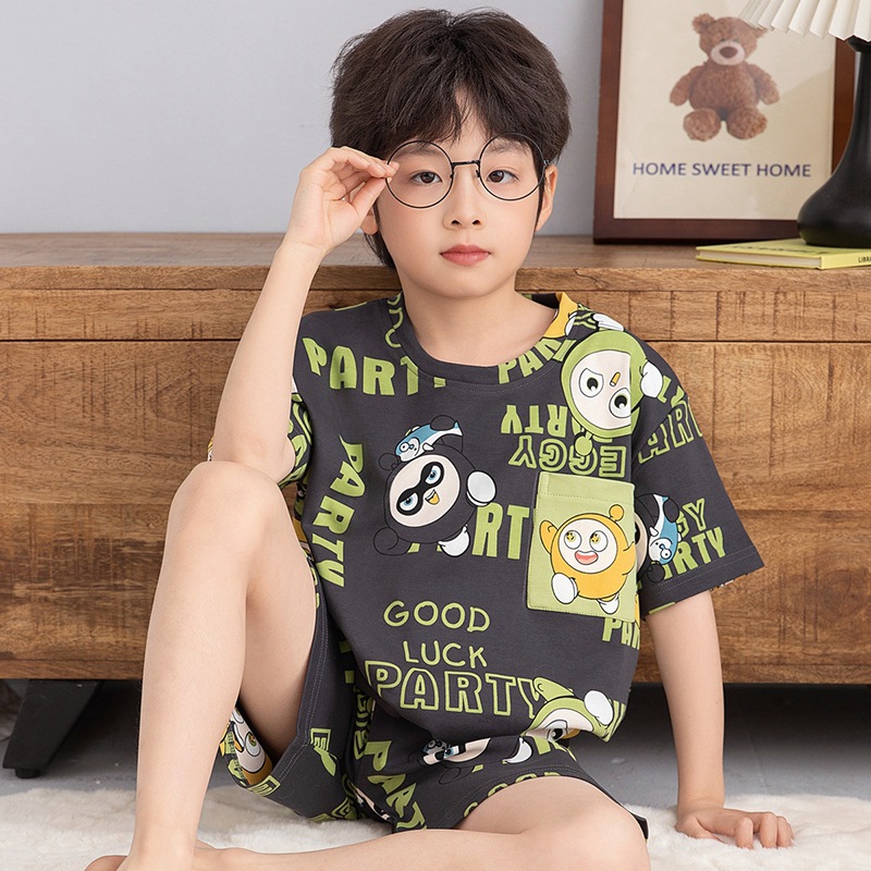 소년을위한 어린이 잠옷 여름 얇은 순수면 반팔 크레용 작은 새 소년 귀여운 중형 및 대형 어린이 에어컨 의류 세트
