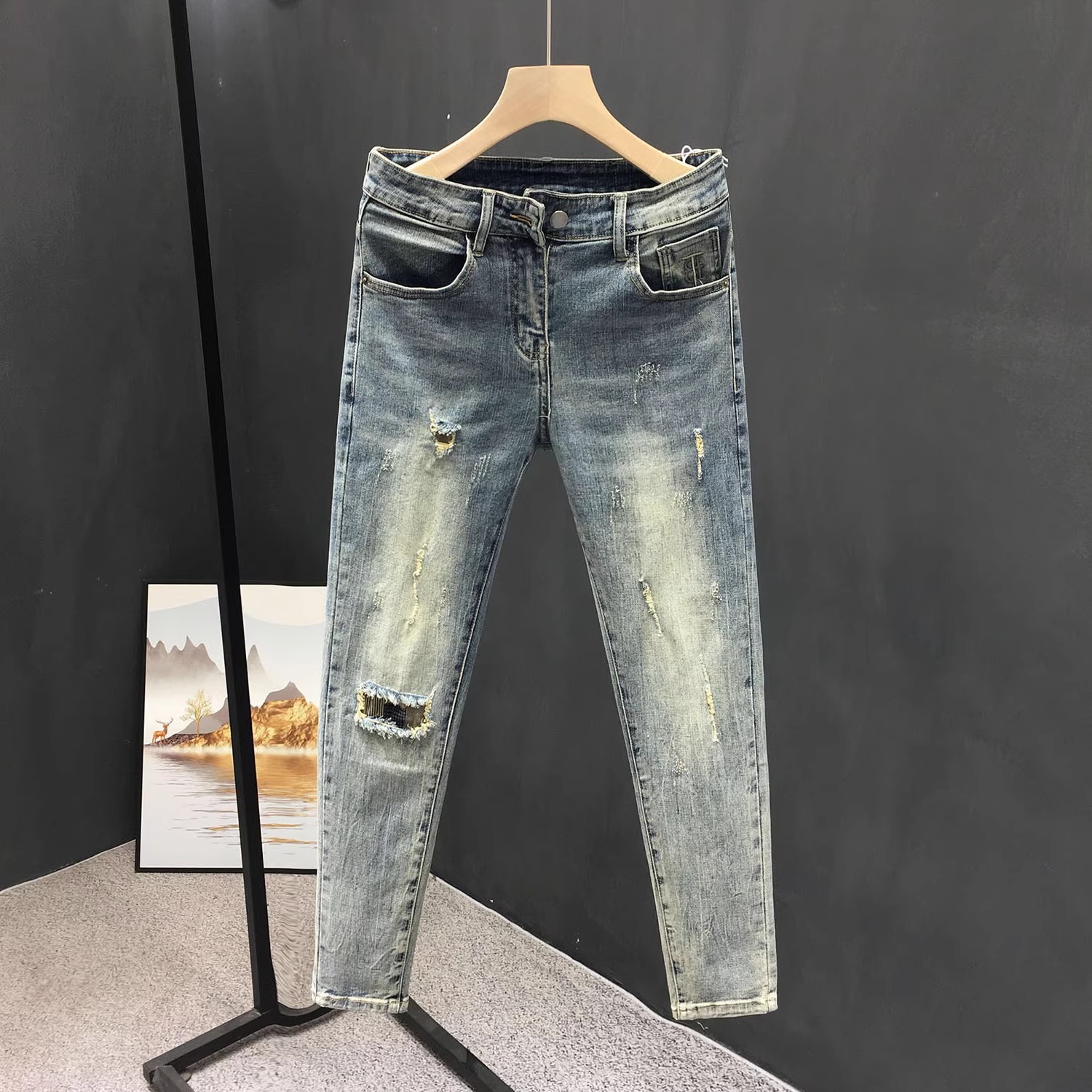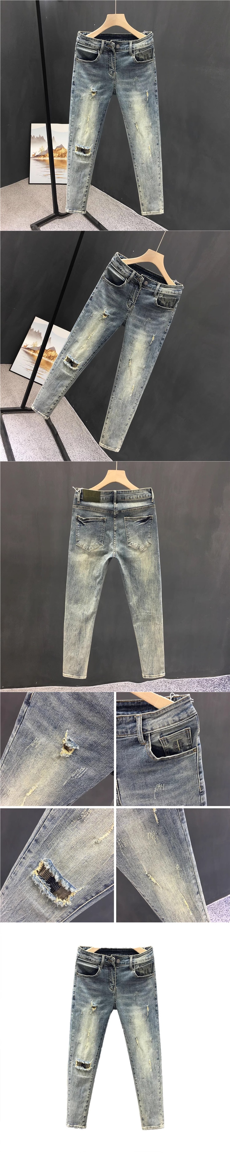 봄과 가을 청바지 남자의 찢어진 발 바지 캐주얼 슬림 슬림 약간 탄성 남성용 바지 도매스토어 가기
