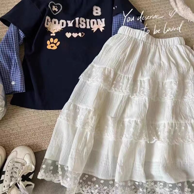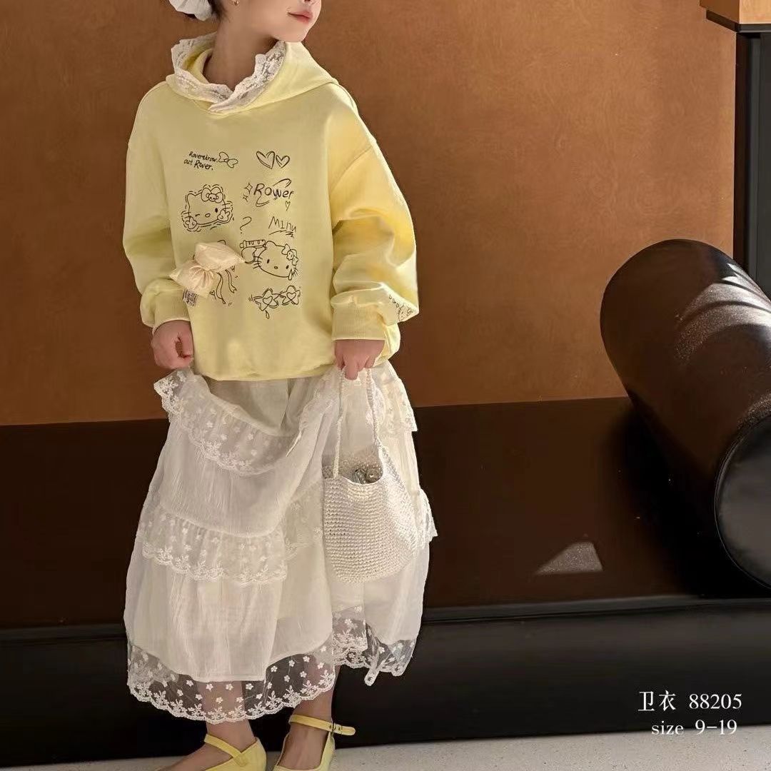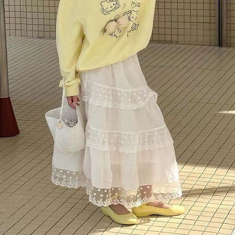 여자 한국 스타일 서양식 레이스 원피스 2025 봄 새로운 달콤한 바느질 케이크 원피스 어린이 중간 길이 원피스