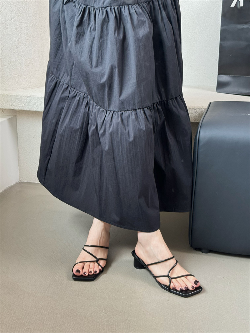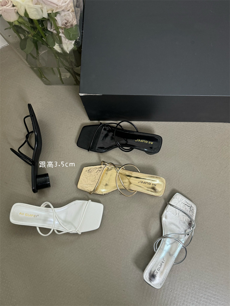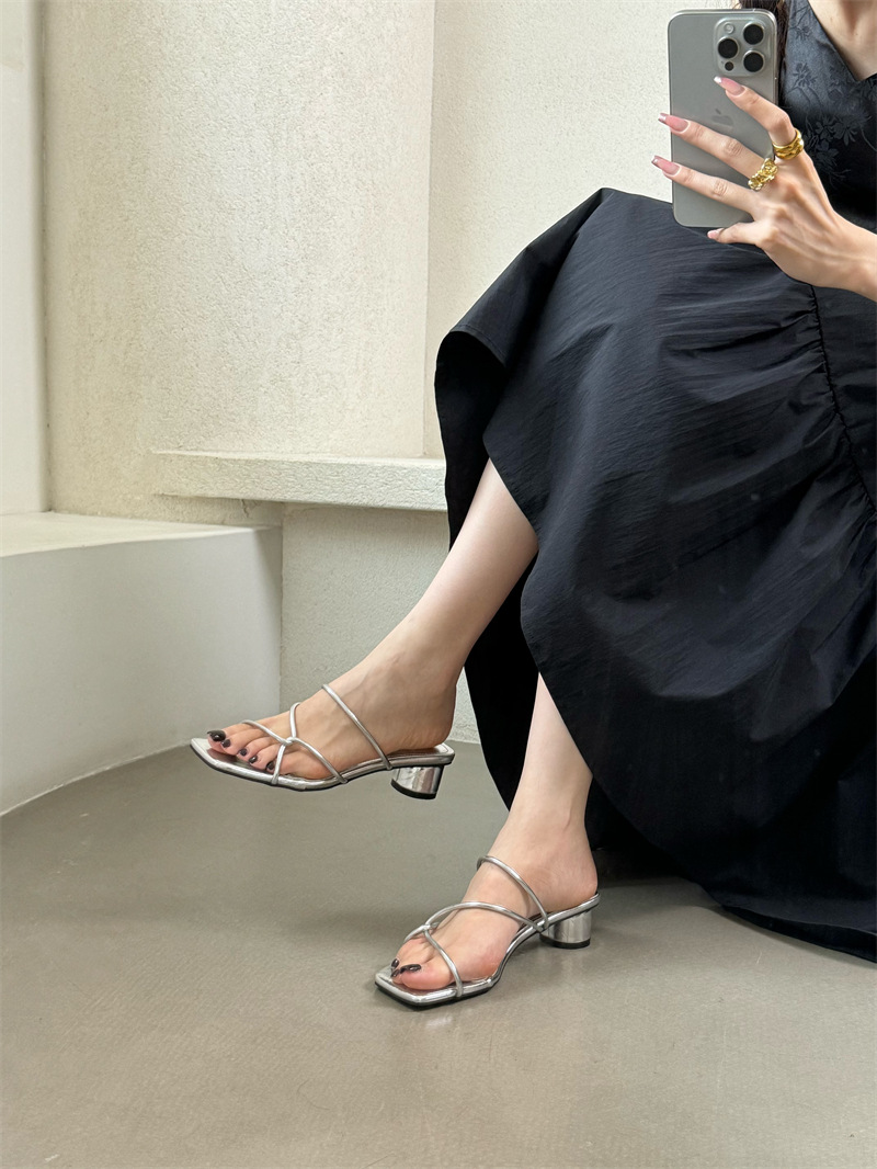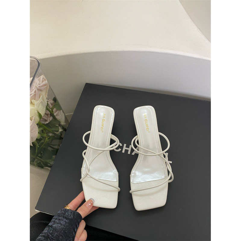 여성을위한 절묘한 간단한 얇은 스트랩 샌들 및 슬리퍼 2025 여름 새로운 스타일 외부 착용 부드러운 바닥 디자인 스퀘어 헤드 미드 힐 슬라이드스토어 가기