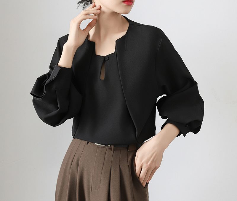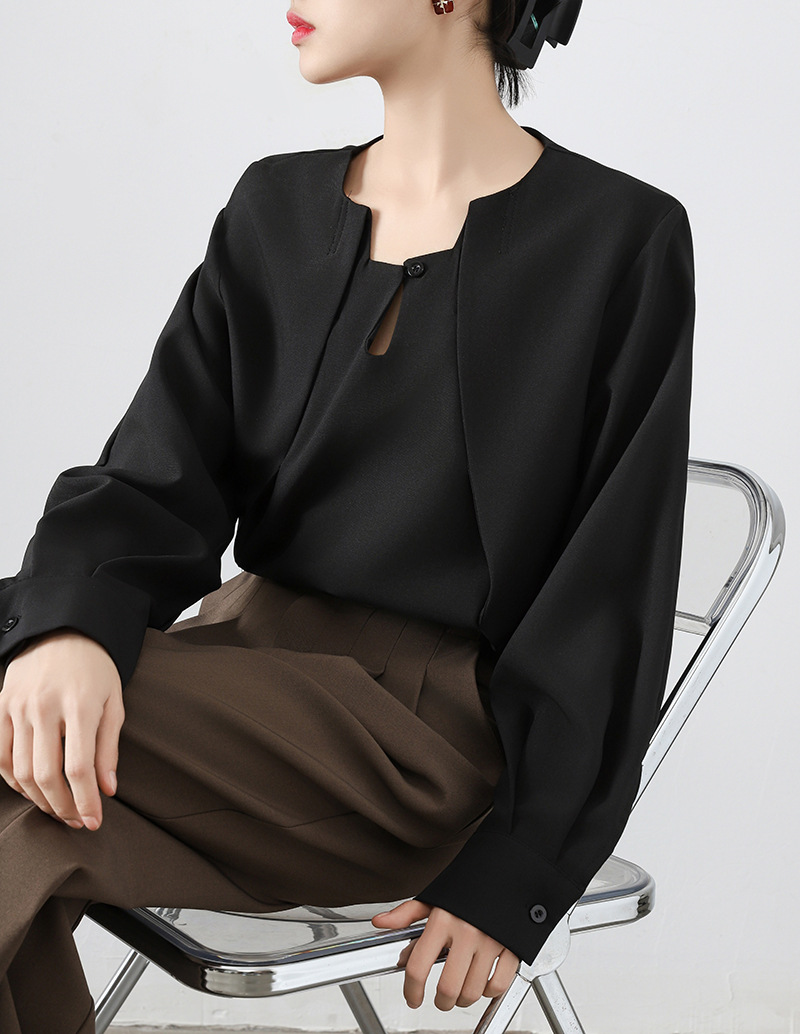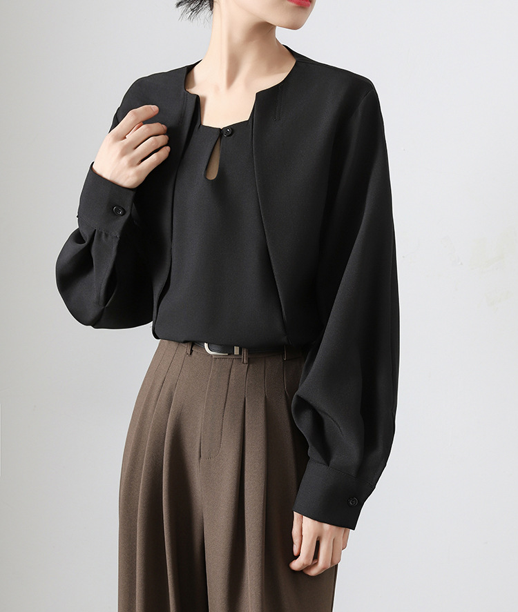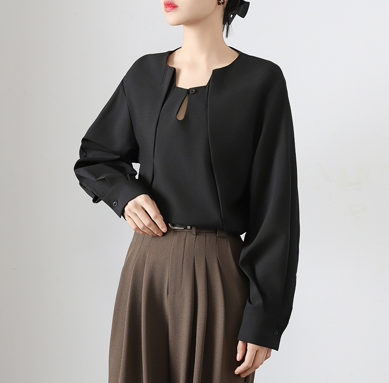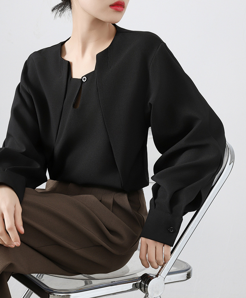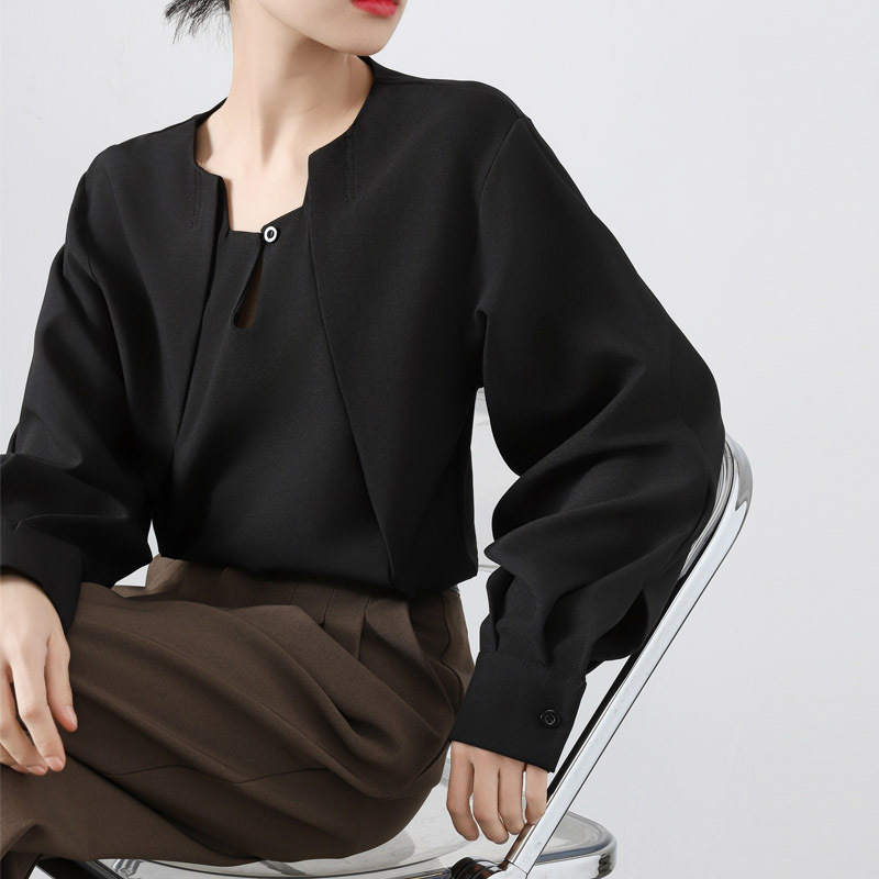 디자인 센스 블랙 긴팔 셔츠 여자의 봄과 여름 새로운 우아한 통근 불규칙한 chic 느슨한 올 매치 셔츠