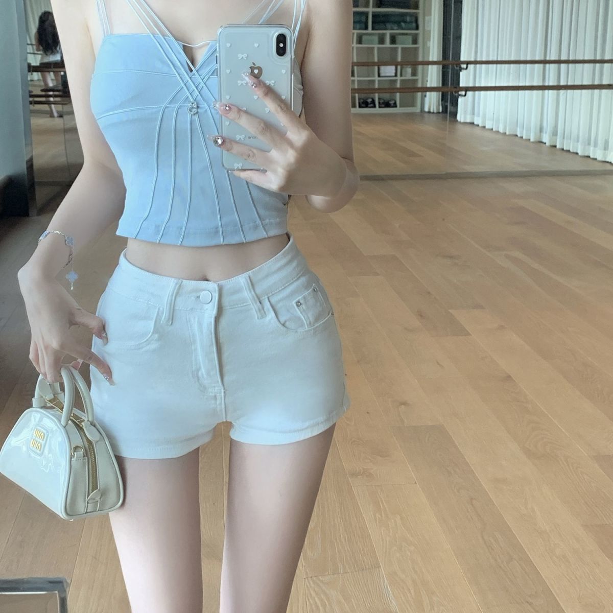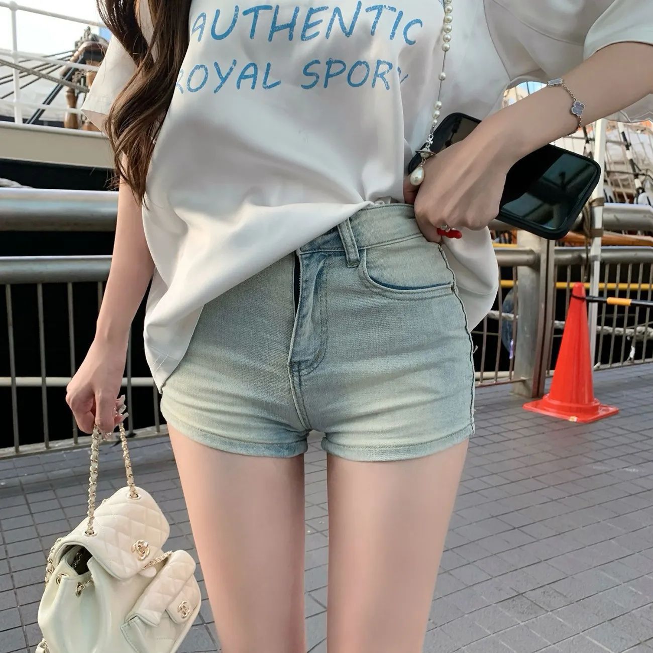 밝은 색 씻은 스파이스 소녀 높은 허리 데님 반바지 여성의 여름 복고풍 스트레치 단단한 몸-슬리밍 A-모양의 뜨거운 바지