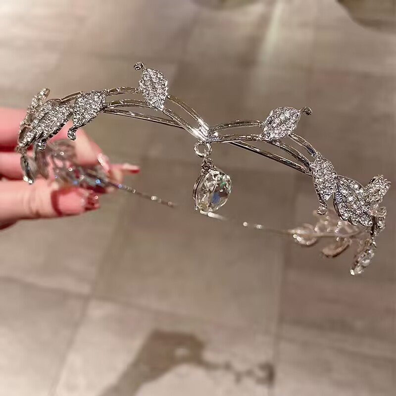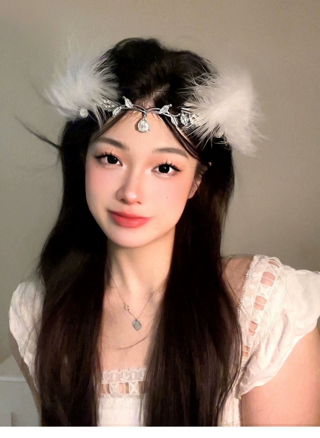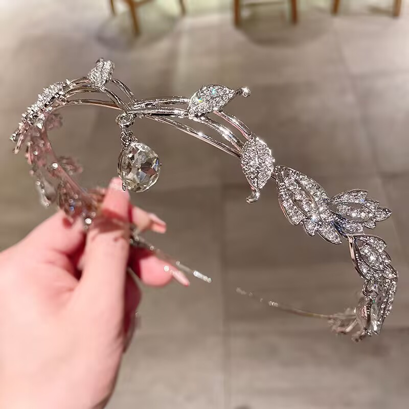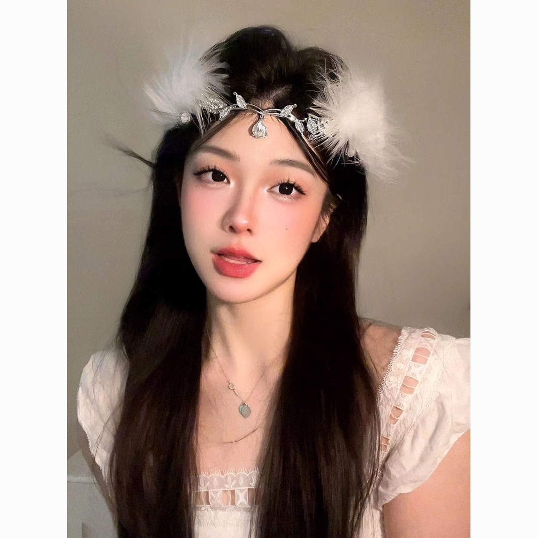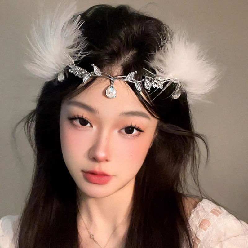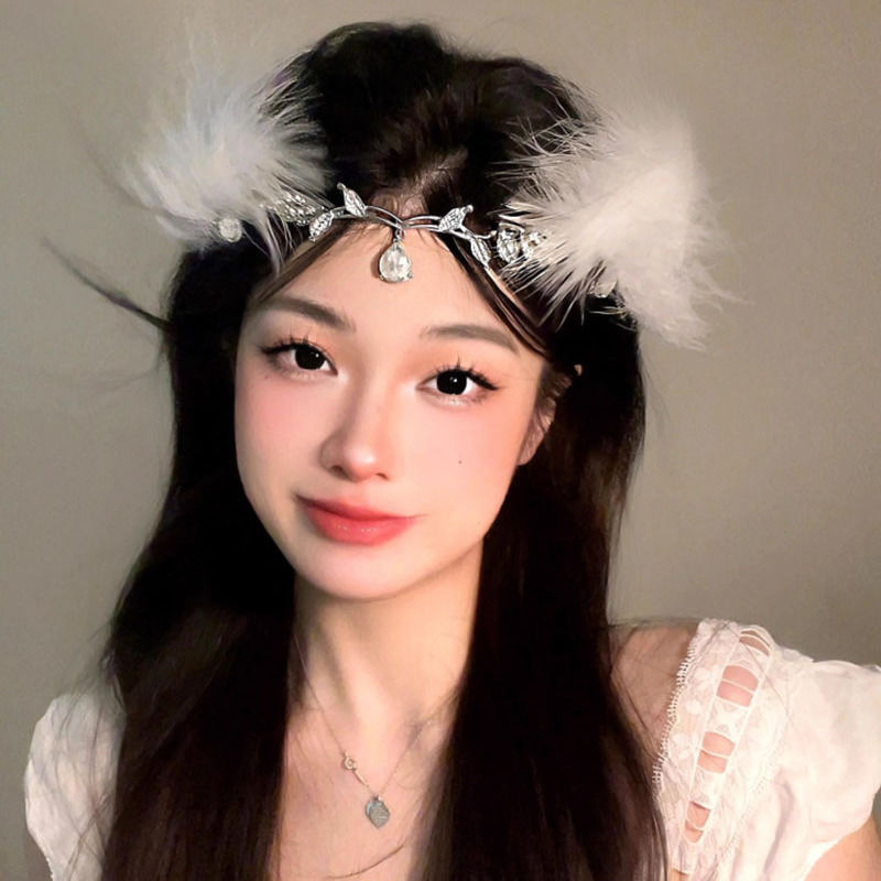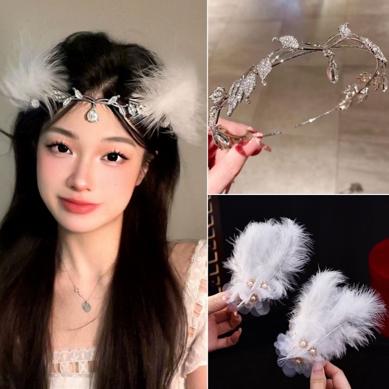 • 크리스탈 이마 왕관 + 흰색 깃털 머리핀 한 쌍
