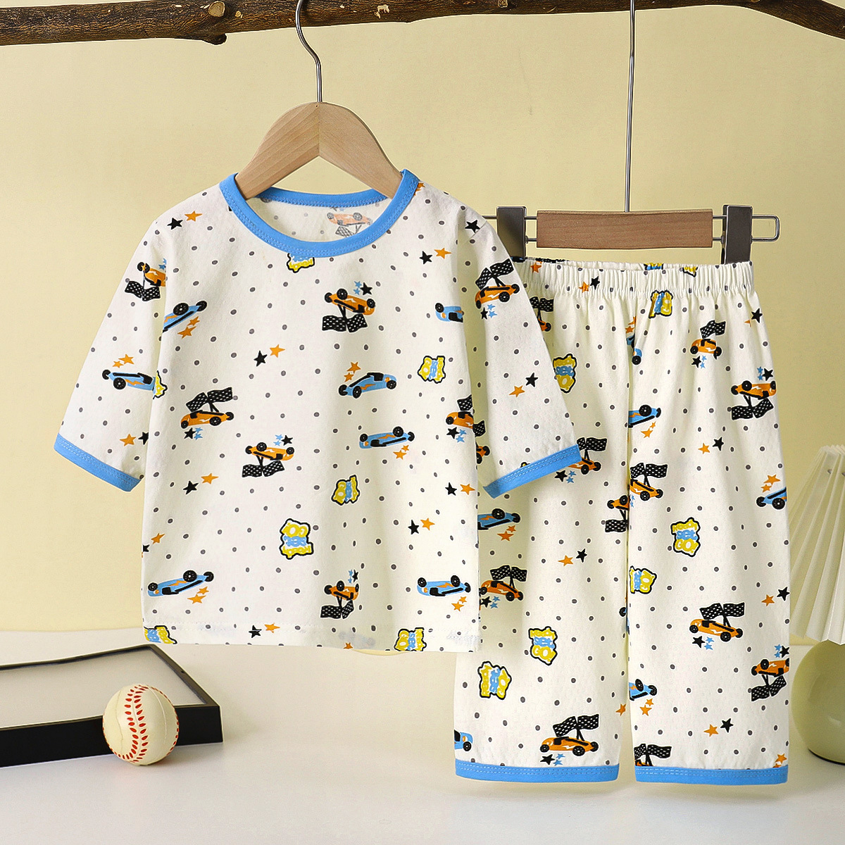 여름 새 소년 에어컨 의류 순수 코튼 자카드 소녀의 집 옷 둥근 목 인쇄 7 점 어린이 잠옷 세트