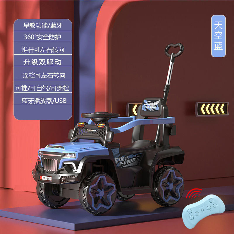 • 하늘색 + 완전 밀폐형 가드레일 + 푸시 핸들 조향 + 3단 고저 조절 - [전동 푸시 핸들 리모컨] 듀얼 드라이브 + 블루투스 음악 + 가죽 시트