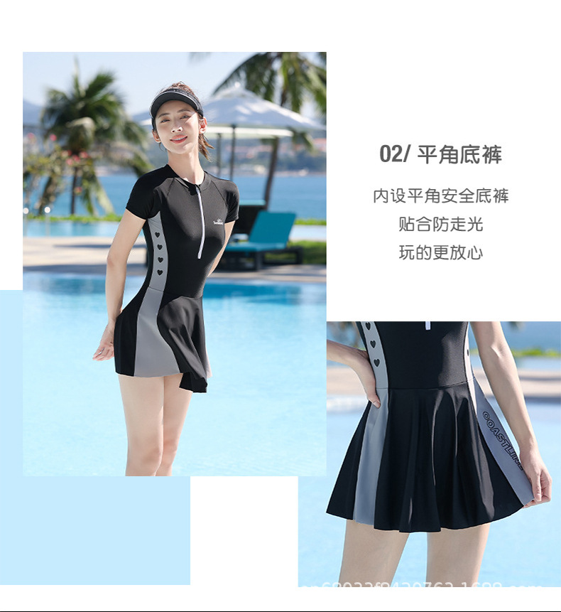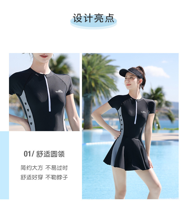 새로운 도착 수영복 여성의 보수적 인 스포티 스커트 짧은 소매 지퍼