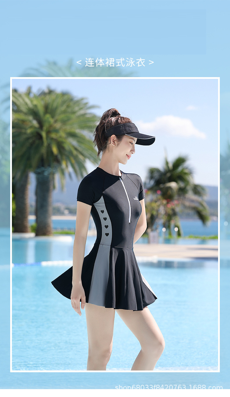 새로운 도착 수영복 여성의 보수적 인 스포티 스커트 짧은 소매 지퍼스토어 가기
