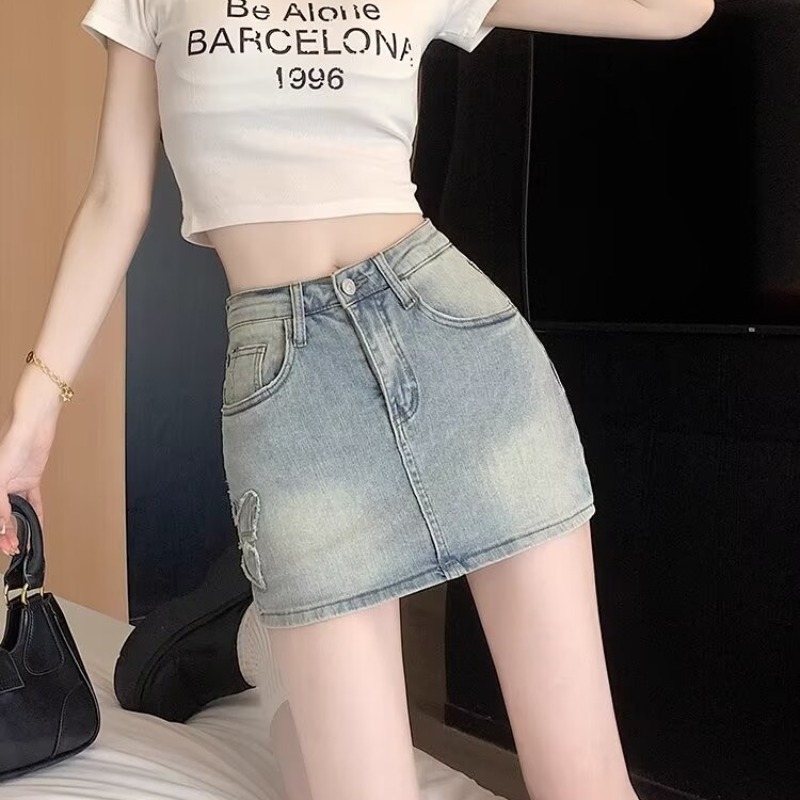 데님 짧은 치마 여자 2025 여름 새로운 스타일 뜨거운 소녀 높은 허리 자수 안티 러닝 라이트 스커트 슬림 핏 힙합 스커트스토어 가기