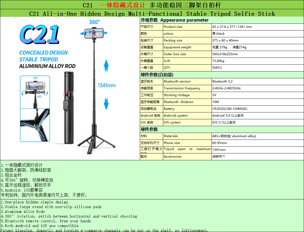 새로운 C21 숨겨진 통합 셀카 스틱 여행 휴대용 휴대 전화 삼각대 다기능 라이브 사진 스탠드