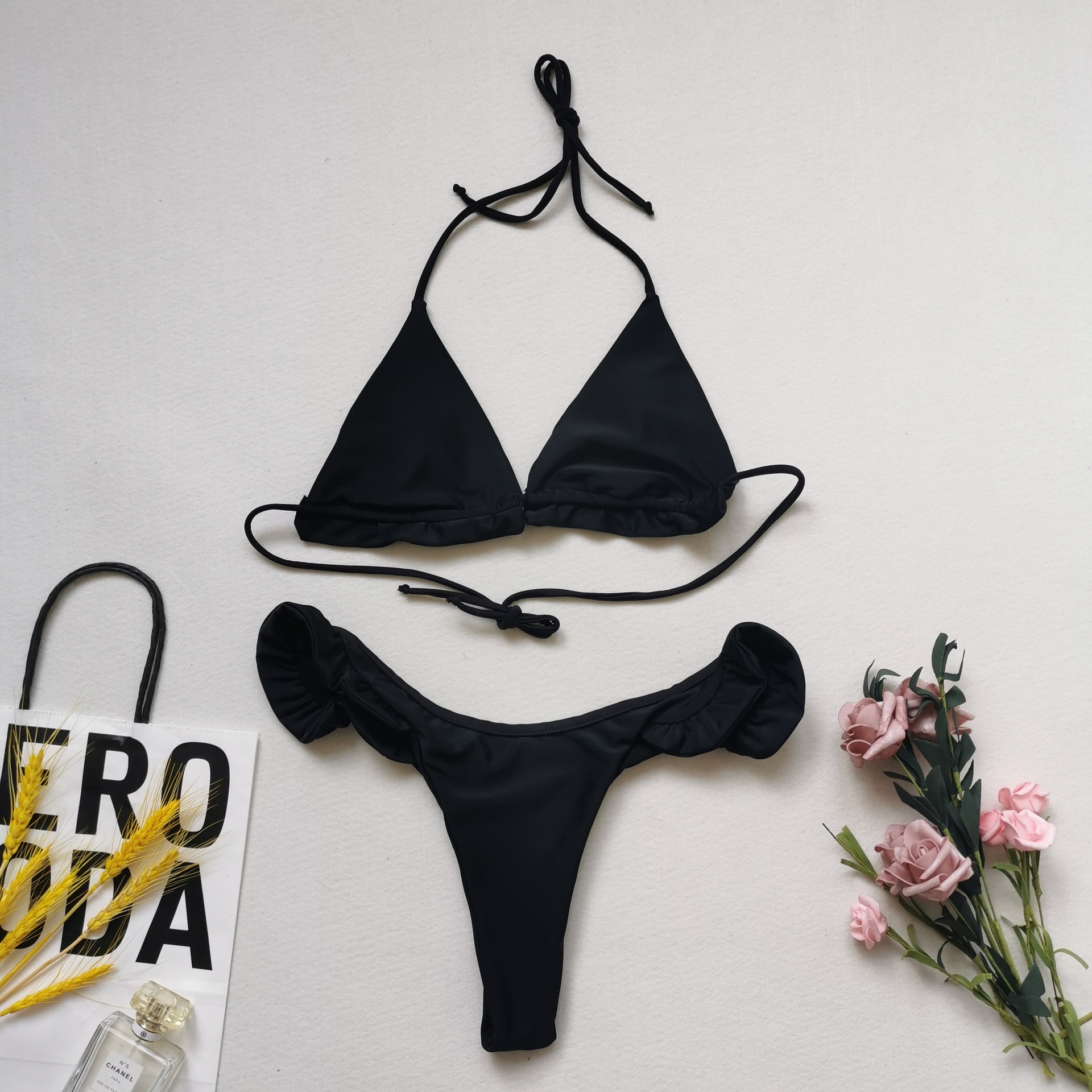 유럽 및 미국 스타일 단색 분리형 수영복 여성용 홀터넥 끈 섹시 수영복 러플 삼각 비키니 도매
