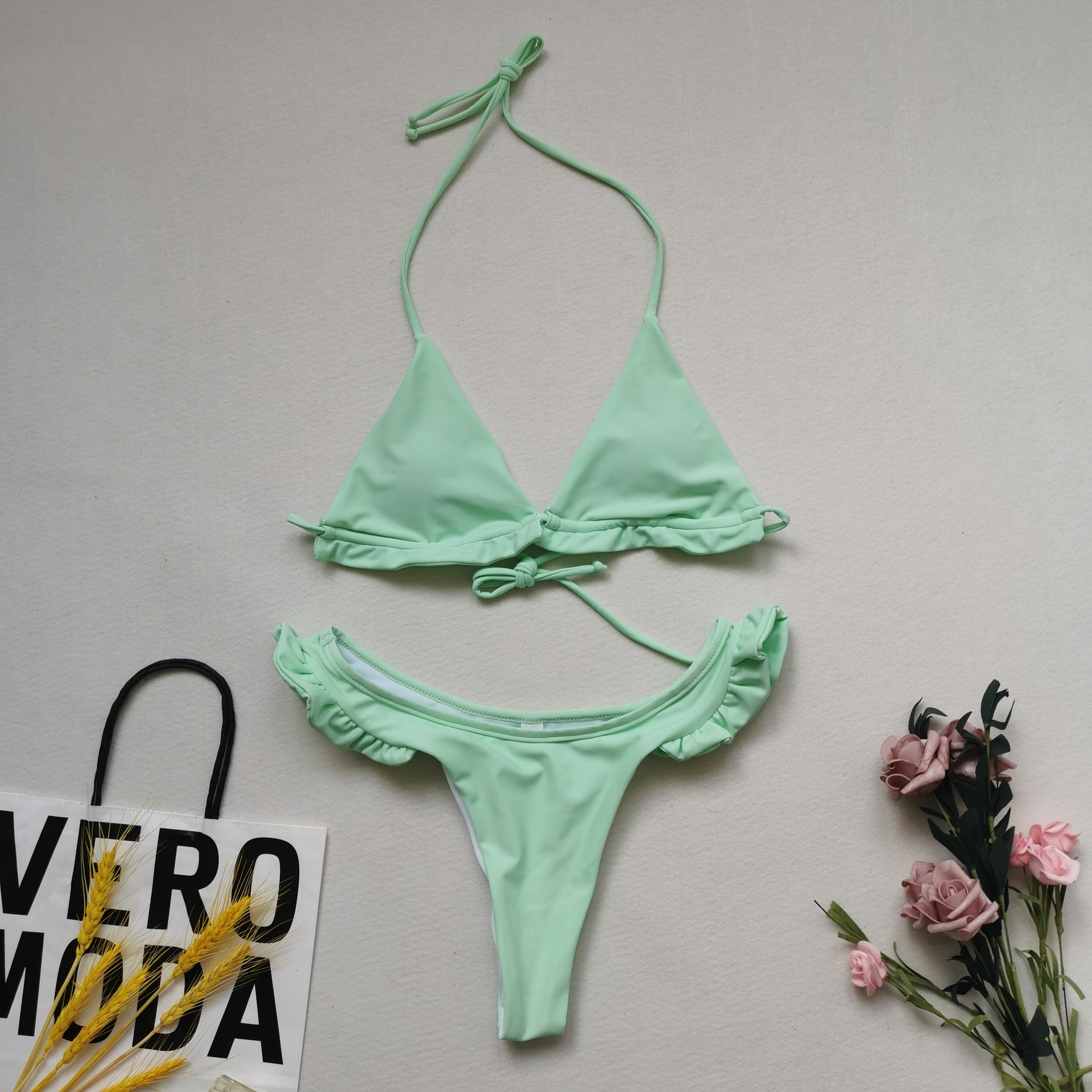 유럽 및 미국 스타일 단색 분리형 수영복 여성용 홀터넥 끈 섹시 수영복 러플 삼각 비키니 도매스토어 가기