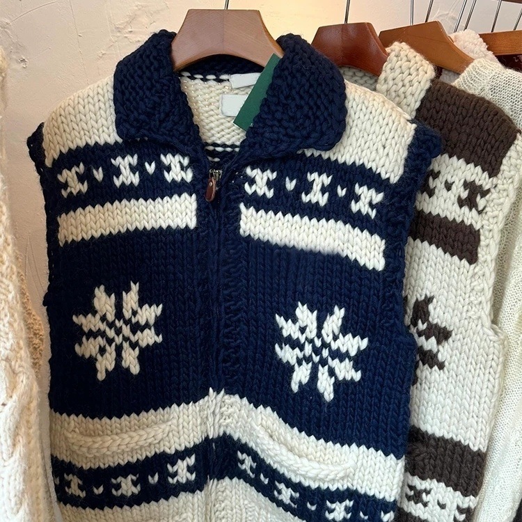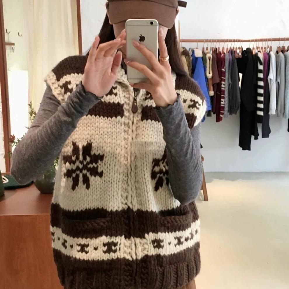 첫 번째 라인 빈티지 페어 아일랜드 자카드 라펠 니트 조끼 여성 가을과 겨울 게으른 느슨한 쌓인 스웨터 조끼스토어 가기